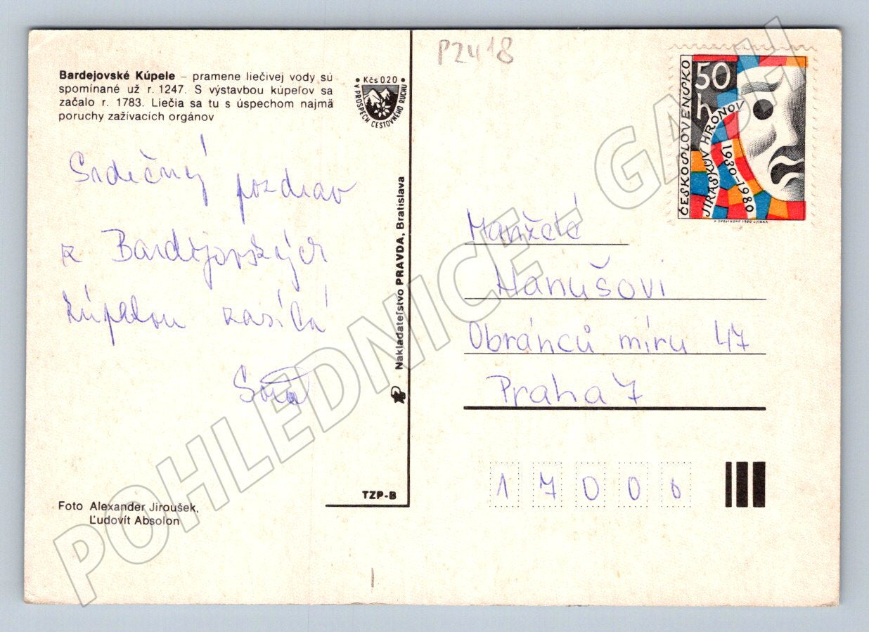 Originální pohlednice se záběry z Bardejovských Kúpelí na Slovensku. Na lícové straně najdete koláž fotografií modernistických budov lázní a jejich okolí. Zadní strana je popsaná, s poštovní známkou a razítkem. Krátký text obsahuje srdečné pozdravy adresované do Prahy. Pohlednice poskytuje pohled na významné lázeňské město, známé svými léčivými prameny již od roku 1247, s tradicí lázní od roku 1783. Jedná se o sběratelský kousek zachycující architekturu a atmosféru slovenského lázeňství druhé poloviny 20. století. Vhodné pro sběratele pohlednic nebo milovníky slovenských reálií.
