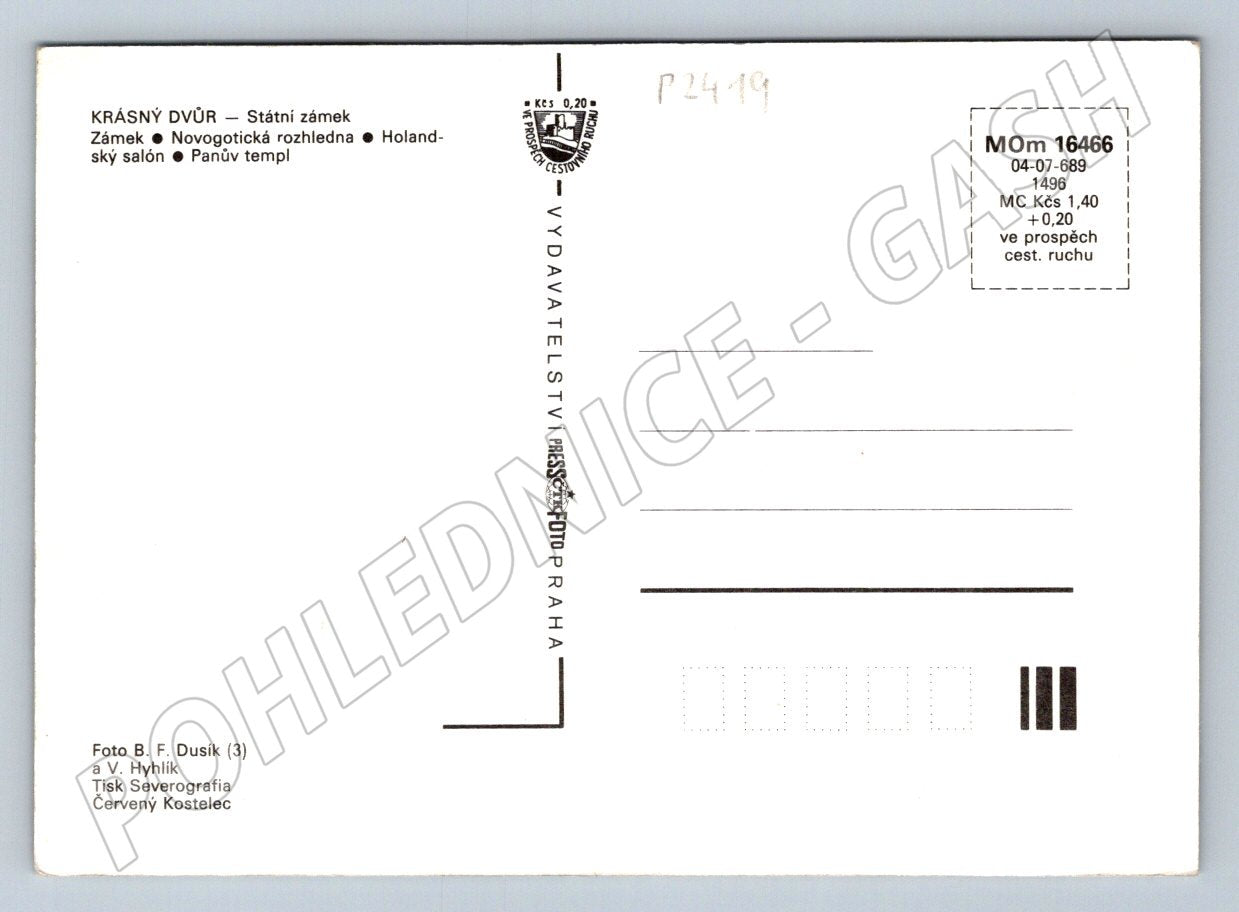 Nabízím originální pohlednici s motivem státního zámku Krásný Dvůr. Pohlednice zachycuje jak exteriéry zámku, tak významné objekty v jeho parku – novogotickou rozhlednu, Holandský salón a Panův templ. Na zadní straně je detailní popis zámku a významných staveb v areálu. Jedná se o krásný sběratelský kousek vhodný pro milovníky historie, architektury či regionálních památek. Pohlednice je v pěkném stavu, bez popsané zadní strany. Vydavatel: Foto B. F. Dusík a V. Hyhlík, tisk Severografia Červený Kostelec.