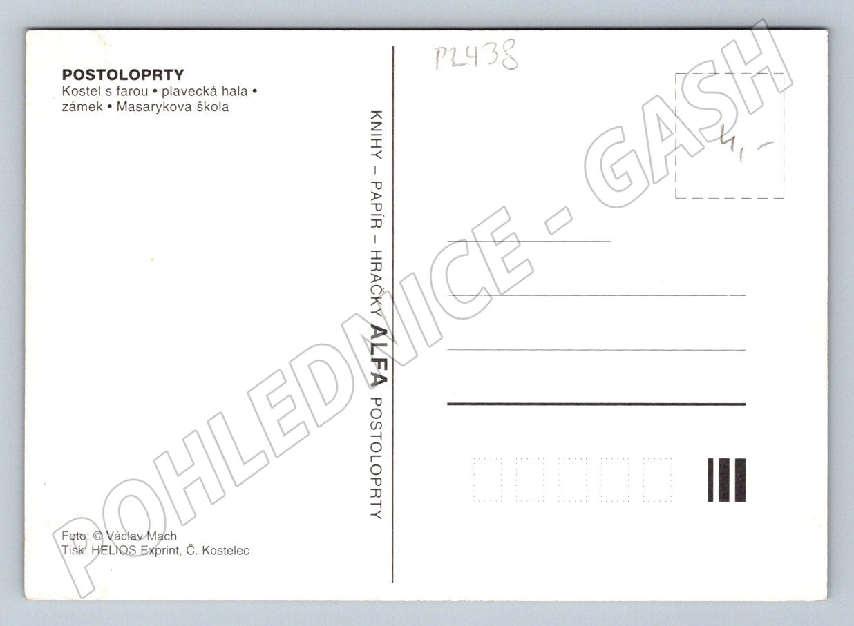 Barevná pohlednice formátu většího než tradiční malý formát, zobrazující různé dominanty města Postoloprty v České republice. Na přední straně jsou fotografie kostela s farou, plavecké haly, zámku a Masarykovy školy, což jsou významné památky a objekty tohoto města. Vydavatel KNIHY-PAPÍR-HRAČKY ALFA Postoloprty, autor fotografií Václav Mach, tisk Helios Exprint Kostelec. Pohlednice je ve velmi dobrém stavu, vhodná pro sběratele českých pohlednic i zájemce o regionální historii.