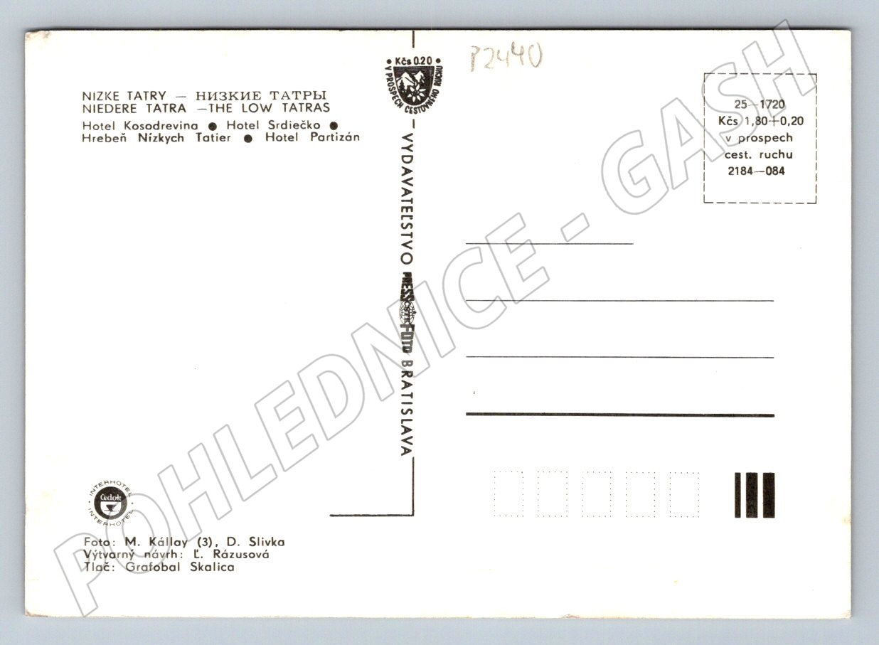 Pohlednice Nízké Tatry zachycuje několik atraktivních turistických míst a hotelů této malebné oblasti. Na přední straně najdete koláž fotografií hotelů Kosodrevina, Srdiečko a Partizán a výhled na hřeben Nízkých Tater i rušnou letní plovárnu. Zadní strana pohlednice je neprošlá a najdete zde text v několika jazycích včetně slovenštiny, ruštiny i němčiny a informace o vydavateli. Fotografii pořídili M. Kállay a D. Slivka, výtvarný návrh vytvořila E. Rázusová. Pohlednice má typický retro vzhled a je zajímavým sběratelským kouskem z období před rokem 1950.