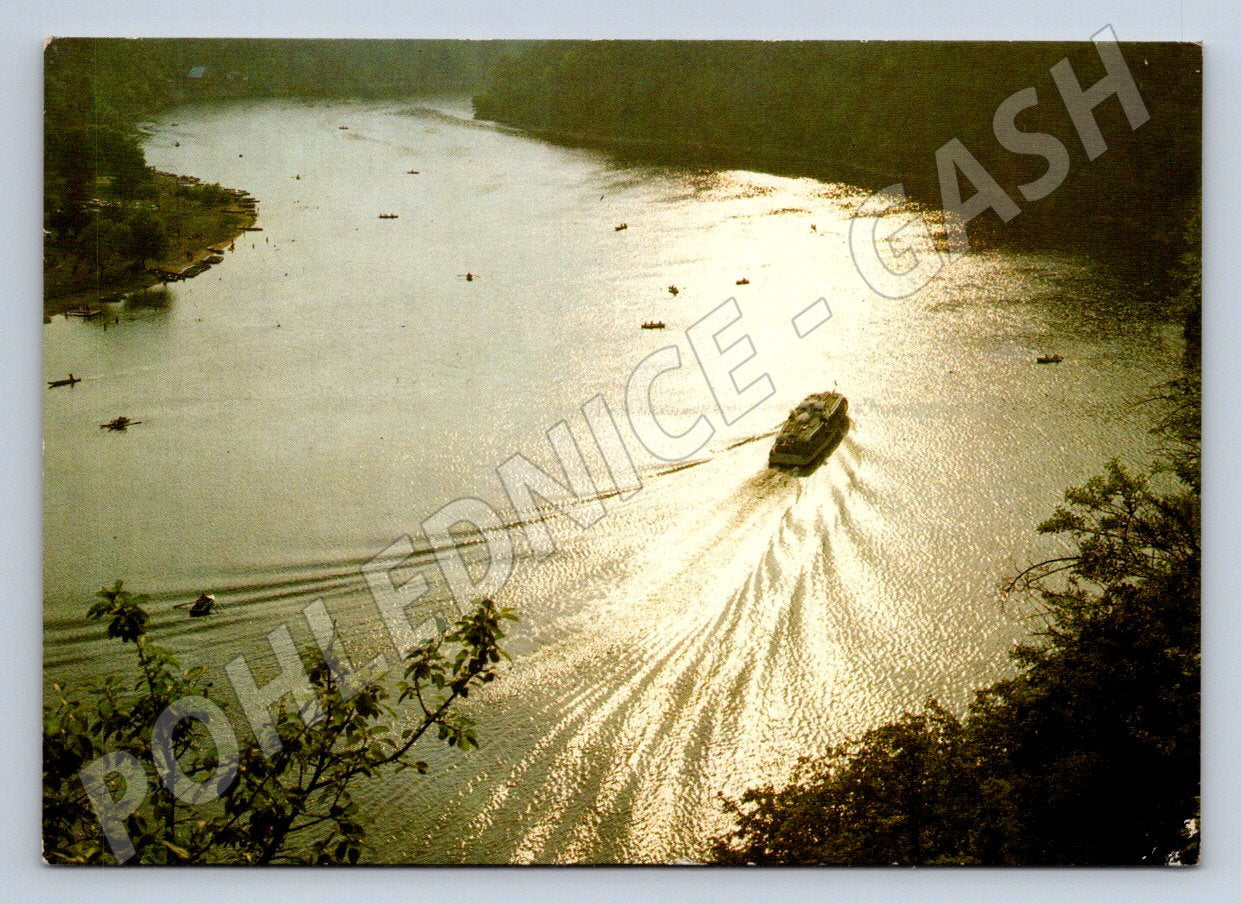Nabízím originální pohlednici zachycující večerní atmosféru na Vranovské přehradě poblíž Chmelnice. Na pohlednici je krásně vidět parník plující po klidné hladině přehrady, zatímco kolem něj projíždí menší lodě. Jedná se o klidnou scenérii české krajiny, pohled z výšky dodává celé kompozici jedinečný ráz. Zadní strana je neprošlá a obsahuje názvy v několika světových jazycích. Autorem fotografie je Milan Racek. Vhodné pro sběratele pohlednic zaměřených na vodní dopravu nebo krásy České republiky.