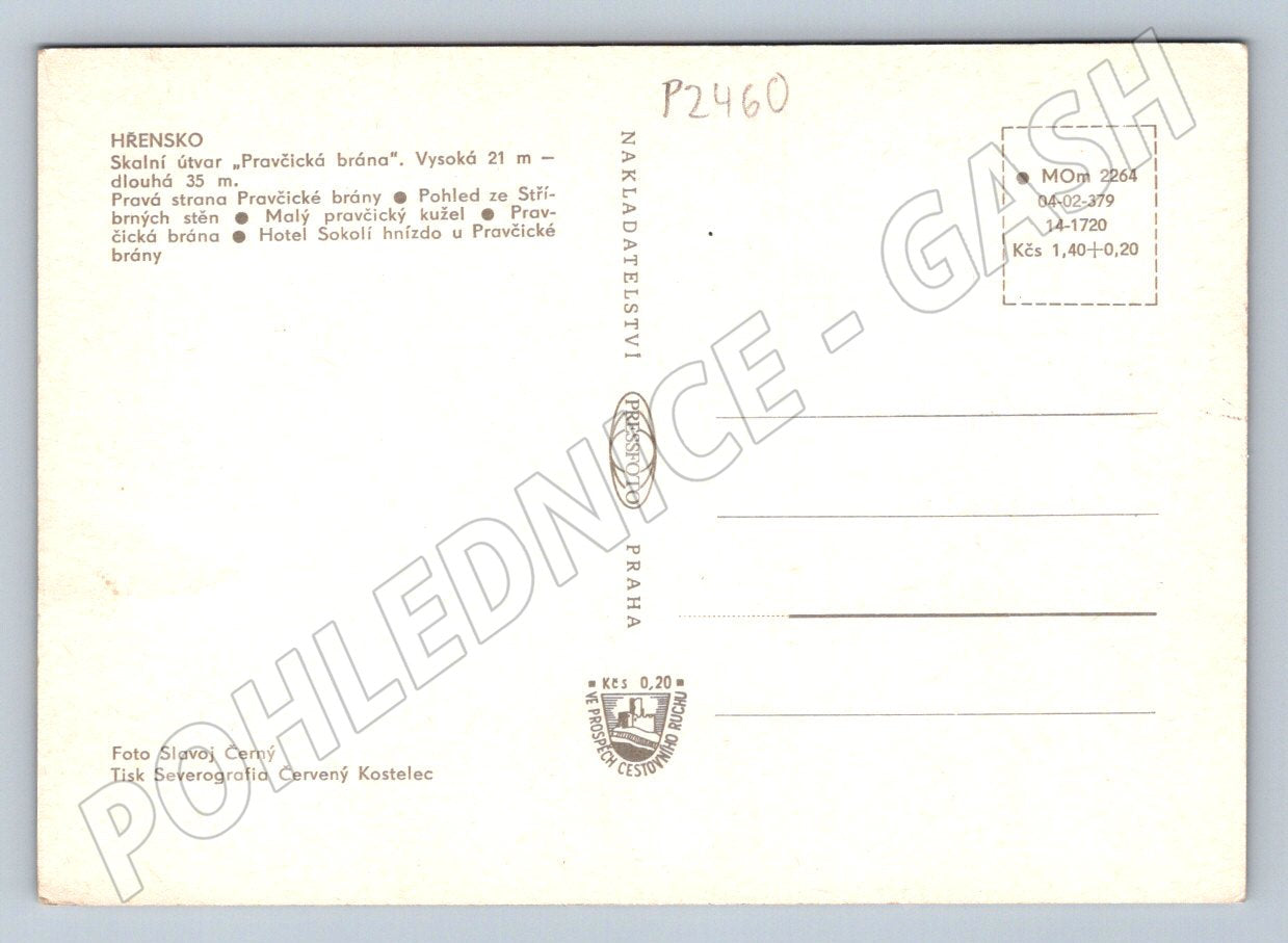 Barevná pohlednice s motivem ikonické Pravčické brány v Národním parku České Švýcarsko. Pohlednice zachycuje jak unikátní skalní útvar, tak i panoramatické výhledy na okolní krajinu a turistickou chatu Sokolí hnízdo. Na zadní straně stručný popis lokality Hřensko a Pravčické brány: skalní oblouk vysoký 21 m a dlouhý 35 m, doplněný popisem jednotlivých částí (kužel, vyhlídky, hotel). Pohlednice je neprošlá poštou a ve výborném sběratelském stavu. Vydání Severografia, foto Slavoj Černý.