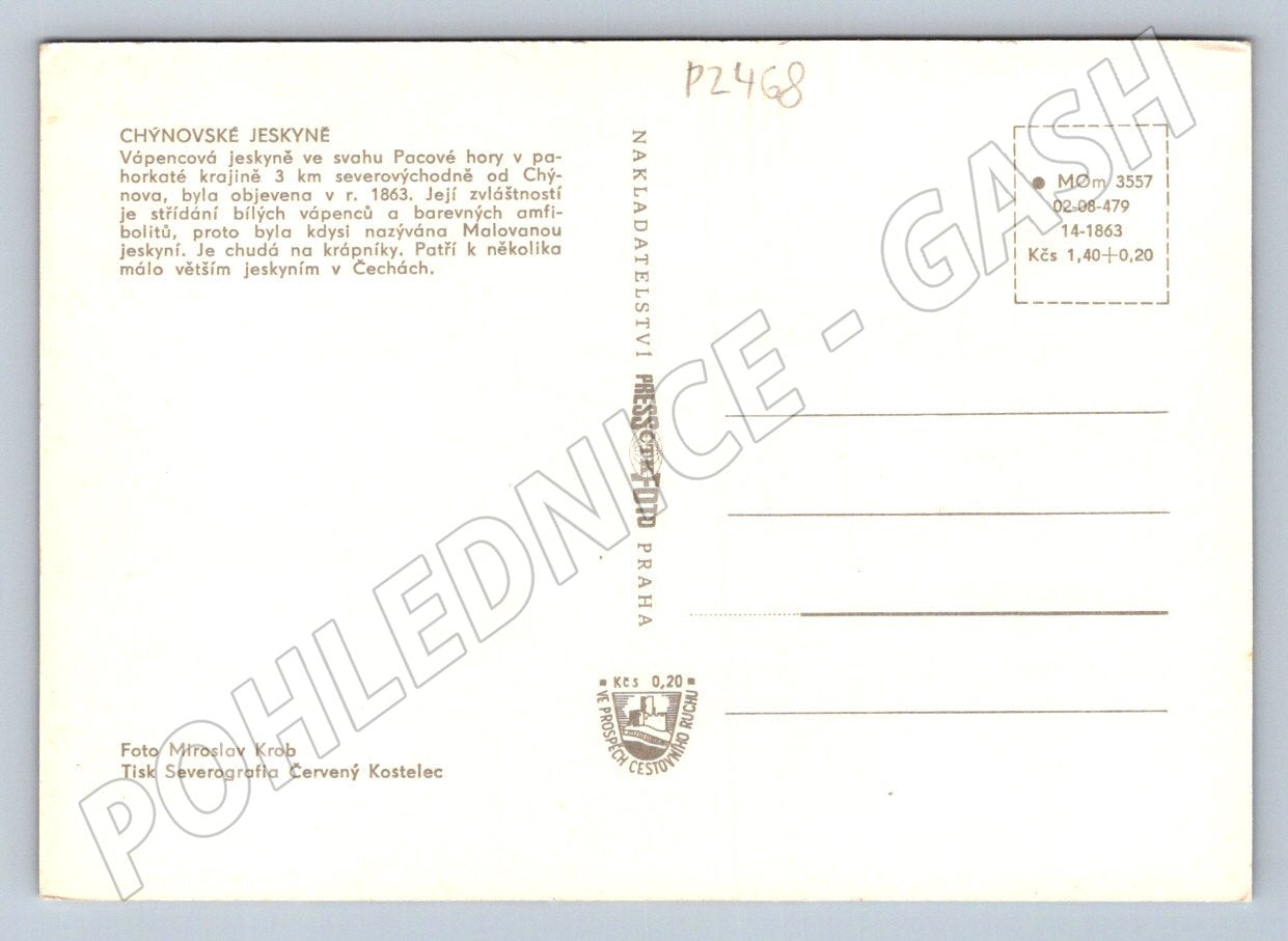 Originální pohlednice Chýnovské jeskyně zachycuje jedinečné vápencové jeskyně nedaleko Chýnova. Na přední straně fotografie a barevné snímky představují jak exteriér vstupu do jeskyní, tak rozmanité vnitřní prostory a krápníky. Text na zadní straně popisuje historii objevení jeskyní v roce 1863 a jejich zvláštnosti - střídání bílých vápenců a barevných amfibolitů, kvůli čemuž byly známé i pod názvem Malovaná jeskyně. Patří mezi několik málo větších jeskyní v Čechách, jsou však chudé na krápníky. Pohlednice je ve velmi pěkném stavu, vhodná pro sběratele nebo milovníky českých historických památek.