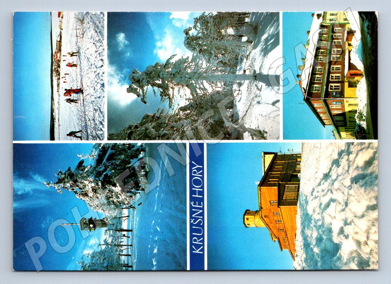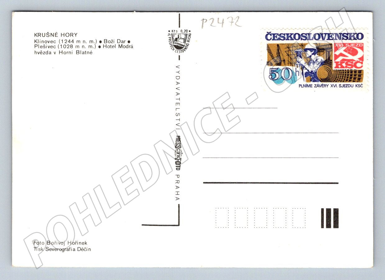 Originální pohlednice zobrazující krásy Krušných hor v zimě se skiareály, zasněženými stromy a významnými hotely. Pohlednice obsahuje panoramatické pohledy na Klínovec (1244 m n. m.), Boží Dar, Plešivec (1028 m n. m.) a hotel Modrá hvězda v Horní Blatné. Jedná se o sběratelský kus z období Československa, který je opatřen původní známkou s tematickým zaměřením XVI. sjezdu KSČ. Na zadní straně jsou základní informace o lokalitě, autor fotografie je Bořivoj Hořínek a tisk provedla Severografia Děčín. Pohlednice je v dobrém stavu.