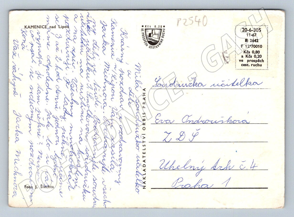 Originální barevná pohlednice s motivem zámku v Kamenici nad Lipou. Na přední straně je zachycena nádherná fasáda zámku s hodinovou věží a přilehlý park s kašnou a lavičkami. Zadní strana obsahuje ručně psaný vzkaz a adresu, pohlednice byla skutečně odeslána. Vydal Orbis Praha, fotografie J. Šlechta. Pohlednice je datována do období socialistického Československa. Ideální pro sběratele pohlednic zaměřených na hrady a zámky, nebo milovníky českých památek. Stav pohlednice odpovídá stáří, rohy jsou mírně opotřebované, barvy dobře zachované.