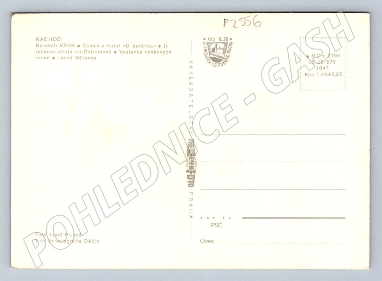 Originální pohlednice města Náchod s koláží záběrů významných památek a míst. Pohlednice zachycuje náměstí, historické budovy, panoráma zámku, výstavbu panelových domů a lázeňský park. Na zadní straně je stručný popis jednotlivých motivů: náměstí VŘSR, zámecký hotel U Beránka, Jiráskova chata na Dobrošově, panelová výstavba a Lázně Běloves. Autorem fotografie je Josef Hanuš. Pohlednice pochází z období socialismu, jedná se o barevnou, nepopsanou a neprošlou poštou sběratelskou pohlednici.
