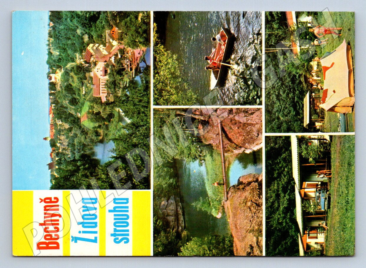 Barevná pohlednice z oblasti Bechyně – Židova strouha. Na přední straně je koláž více fotografií s výjevy z okolní krajiny, řeky a rekreační oblasti, včetně kempu a loděk. Pohlednice byla odeslána z Československa, má známku s označením ČSSR a poštovní razítko. Na zadní straně se nachází ručně psaný text a adresa adresáta. Vydavatel: Orbis, Praha. Tisk OTK 41 – Hradišťko pod Medníkem. Velmi dobrý sběratelský stav vzhledem ke stáří.