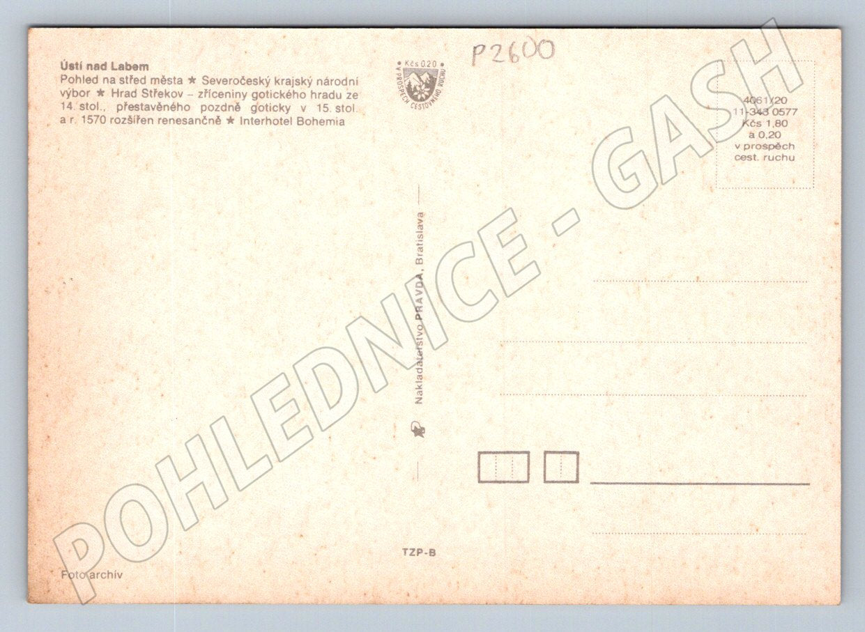 Originální pohlednice s více fotografiemi z města Ústí nad Labem. Na přední straně jsou zachyceny významné pohledy na centrum města, krajský úřad, hrad Střekov a Interhotel Bohemia. Pohlednice krásně ilustruje architekturu, historická místa i přírodní scenérie této oblasti. Na zadní straně je stručný popis jednotlivých motivů: pohled na centrum, Severočeský krajský národní výbor, hrad Střekov (zřícenina gotického hradu ze 14. stol., přestavěn v 15. stol. a rozšířen renezančně r. 1570), Interhotel Bohemia. Vydáno nakladatelstvím Pravda, Bratislava. Výborný sběratelský stav, vhodná do kolekce zaměřené na česká města, historickou architekturu nebo Ústecko.