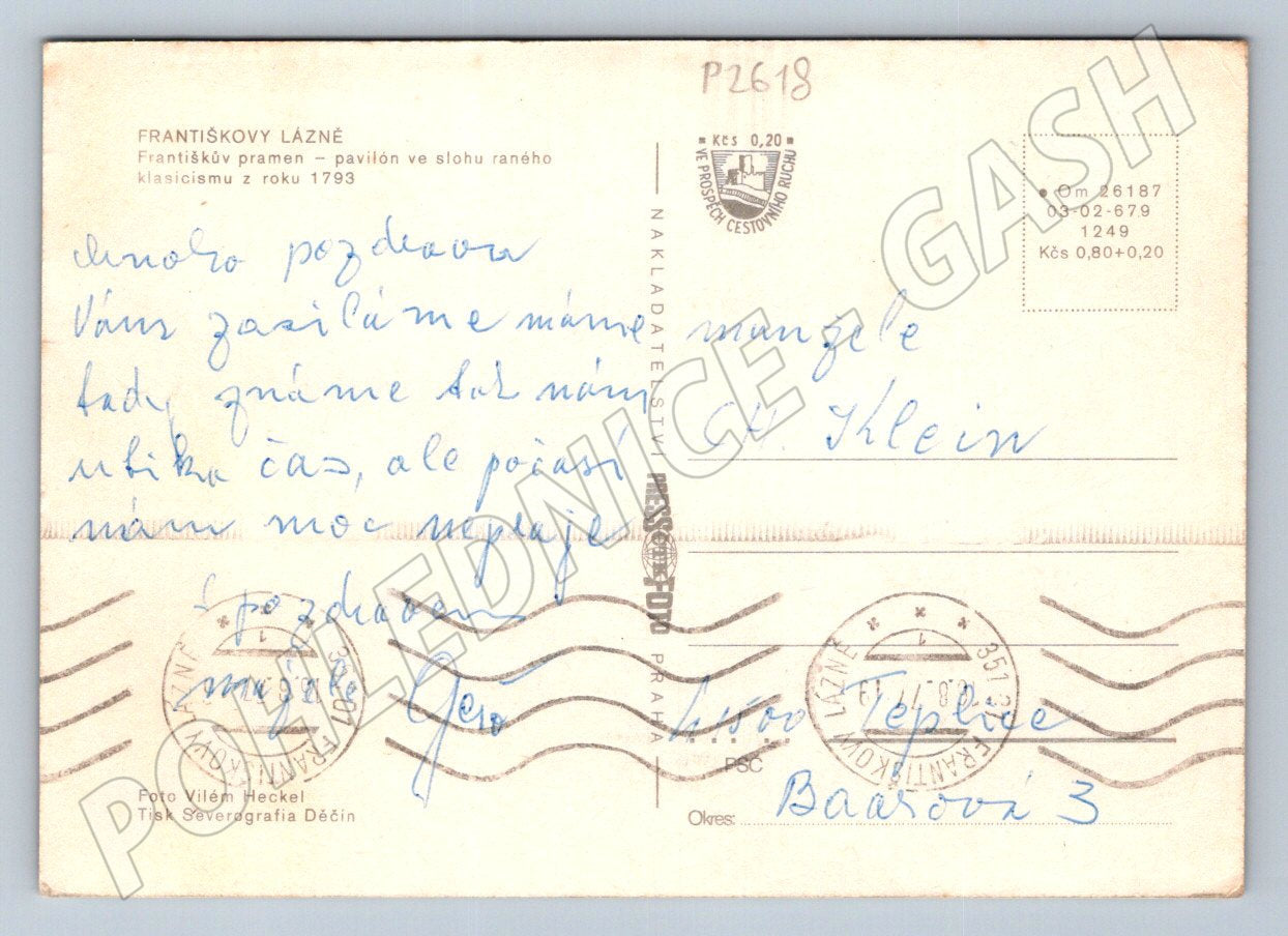 Originální stará pohlednice z lázeňského města Františkovy Lázně. Na fotografii je zachycen Františkův pramen s pavilonem ve stylu raného klasicismu z roku 1793, krásně upravený lázeňský park s květinovou výzdobou a sochou. Na zadní straně poštovní razítko Františkovy Lázně, ručně psaný pozdrav a známky používání. Nakladatelství: Foto Vilém Heckel, tisk Severografia Děčín. Vhodné pro sběratele historických pohlednic, zájemce o lázeňská města a milovníky architektury. Pohlednice je v dobrém sběratelském stavu, odpovídajícím stáří.