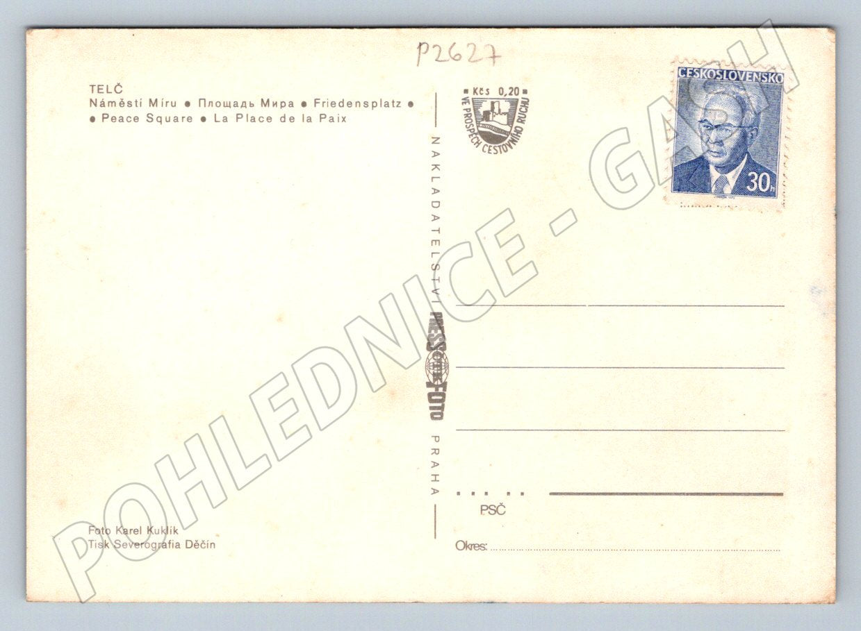 Barevná pohlednice zachycující historické náměstí Míru v Telči s typickými renesančními a barokními domy v pastelových barvách a s fontánou uprostřed náměstí. Na pohlednici je bohatě rozkvetlá květinová výsadba a sochy. Zadní strana je rozdělena pro poštovní použití a opatřena známkou ČSSR o hodnotě 30 h. Fotograf: Karel Kuklík, tisk Severografia Děčín. Pohlednice je v zachovalém sběratelském stavu, vhodná do sbírky českých měst.