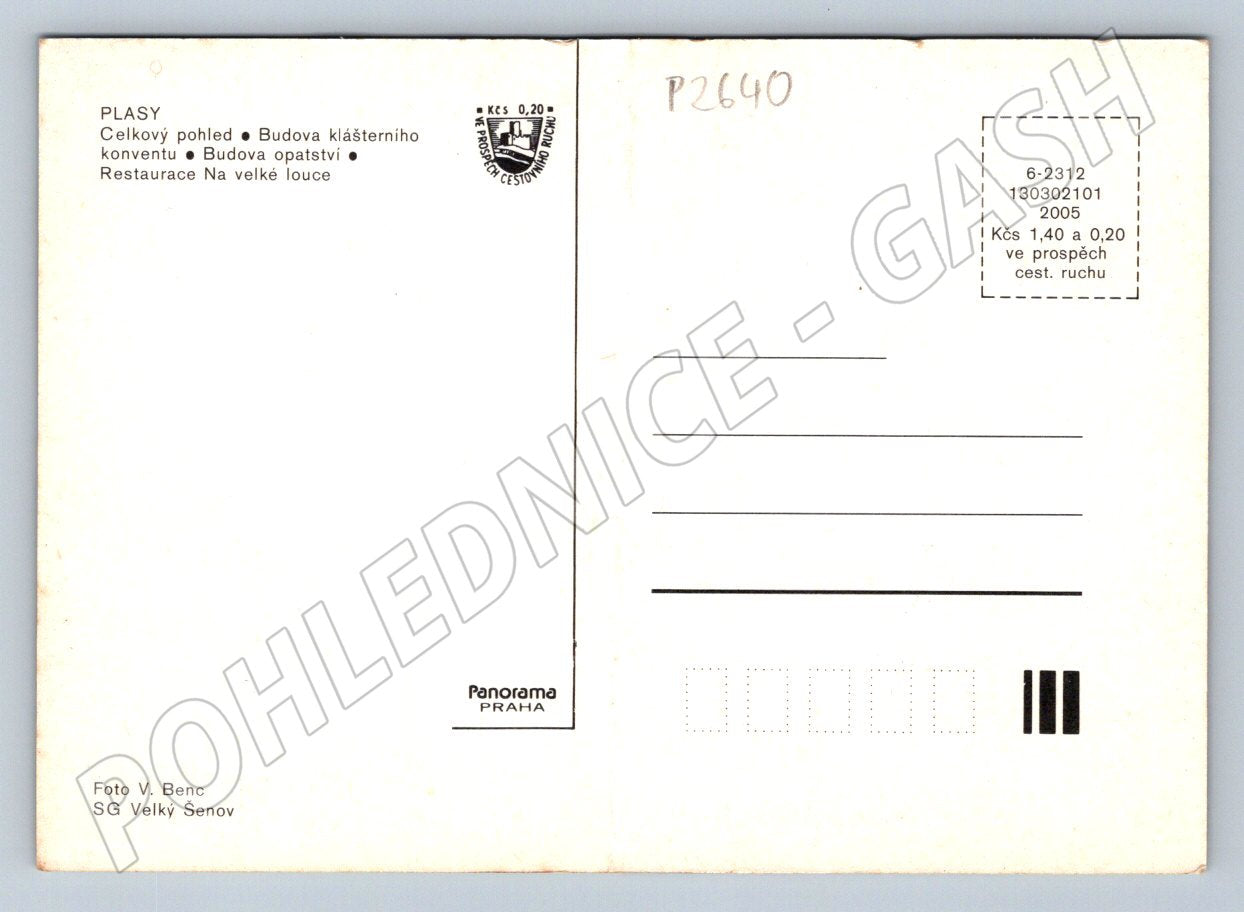 Pohlednice Plasy zachycuje různé pohledy na areál bývalého cisterciáckého kláštera v Plasích. Na přední straně je několik barevných fotografií zobrazujících budovu klášterního konventu, budovu opatství a restauraci Na velké louce v okolním parku. Na zadní straně je tištěný popis v češtině a prostor pro napsání zprávy a adresu. Jedná se o klasickou pohlednici z období socialismu s typickým grafickým zpracováním. Vydal Panorama Praha, foto V. Benč, SG Velký Šenov. Velmi vhodné do sbírky historických pohlednic nebo jako zajímavý dárek pro milovníky památek či Plasů.