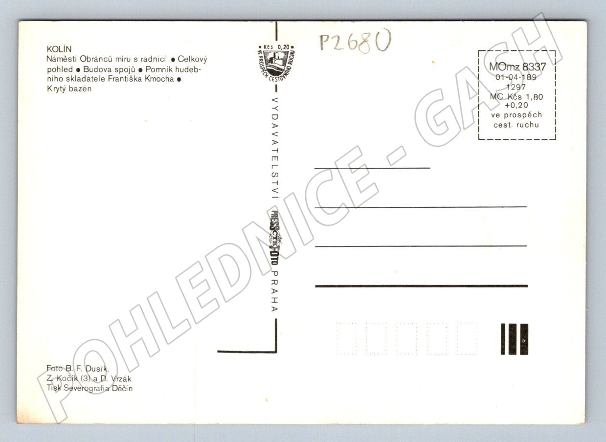 Originální pohlednice města Kolín. Pohlednice nabízí koláž několika významných míst a památek – Náměstí Obránců míru s historickou radnicí, celkový pohled na Kolín, moderní budovu spojů, památník hudebního skladatele Františka Kmocha a krytý plavecký bazén. Na zadní straně popis místa, prostor pro adresu a známku, vytištěné informace o vydavatelství a autorech snímků. Pohlednice je zachovalá, sběratelský stav, bez popisu či poškození. Ideální pro sběratele regionálních pohlednic nebo milovníky města Kolín.