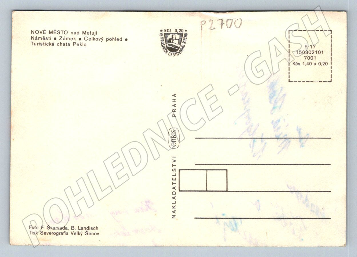 Originální pohlednice Nové Město nad Metují zachycující významné památky a turistická místa tohoto malebného města v severovýchodních Čechách. Na přední straně je koláž fotografií: historické náměstí s malebnými podloubími, zámek s jedinečnou věží, celkový pohled na město a slavná turistická chata Peklo. Pohlednice je v dobrém sběratelském stavu, čistá a nepopsaná, vhodná pro sběratele i jako nostalgická vzpomínka. Zadní strana nese předtištěné poštovní údaje, vydána nakladatelstvím Orbis Praha. Formát pohlednice odpovídá období po roce 1950.