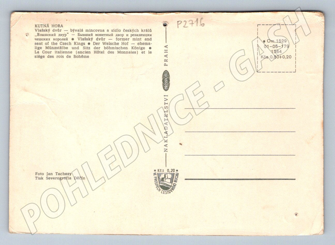 Originální pohlednice s barevným záběrem Vlašského dvora v Kutné Hoře, bývalé mincovny a rezidence českých králů. Na zadní straně je podrobný popis objektu v několika jazycích a informace o vydavateli (Foto Jan Tachezy, tisk Severografia Děčín). Stav pohlednice odpovídá stáří, místy mírně opotřebovaná, viz foto. Ideální doplněk sbírky pohlednic zaměřené na hrady a zámky nebo jako zajímavá upomínka na významnou českou památku.