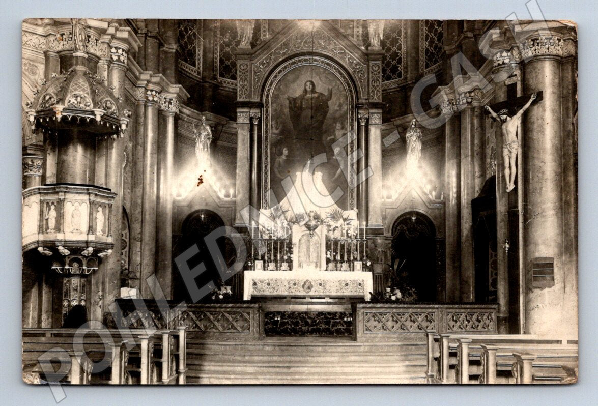 Nabízím starou pohlednici zobrazující interiér kostela nebo katedrály, pravděpodobně českého původu. Na pohlednici je zachycen hlavní oltář s krásnou výzdobou, sochami, kazatelnou a velkým křížem s ukřižovaným Kristem. Pohlednice je v černobílém provedení a je ve vintage stylu. Zadní strana je čistá, bez textu, pouze s drobným číslem tužkou. Jedná se o malý formát, vhodné do sbírky nebo jako dekorace. Stav odpovídá stáří – známky opotřebení, zašpiněná zadní strana. Přesný rok vydání neznám, ale pochází z období do roku 1950.