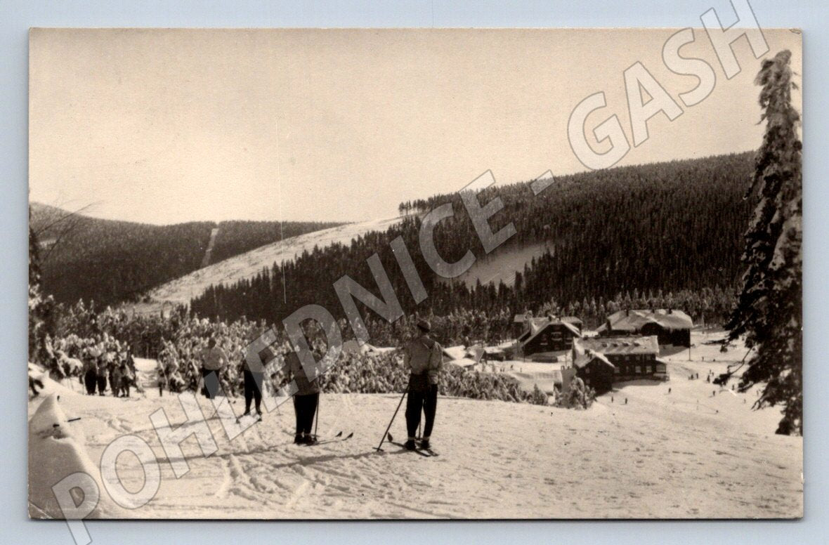 Originální černobílá pohlednice Jeseníky – Červenohorské sedlo. Pohlednice zachycuje zimní scenérii s lyžaři v popředí a horskými chatami uprostřed zasněžených svahů, v pozadí lesy pokryté sněhem. Na zadní straně je ručně psaný text, použitá známka a adresace, což dokládá autentičnost a dobové zasazení. Poštovní známka Československo 30 haléřů a razítko. Výborná atmosféra pro sběratelské účely i milovníky historie Jeseníků a zimních sportů.
