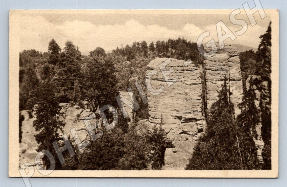 Originální stará pohlednice zobrazující Prachovské skály v Českém ráji, konkrétně partii ze Skalního města. Pohlednice je ve velmi dobrém stavu, nepoškozená, prošlá poštou s razítkem a známkou z období Československa. Na zadní straně ručně psaný text a adresa adresáta. Vhodné pro sběratele historických pohlednic nebo milovníky Českého ráje. Skvělý doklad krajiny a turistických atraktivit první poloviny 20. století.