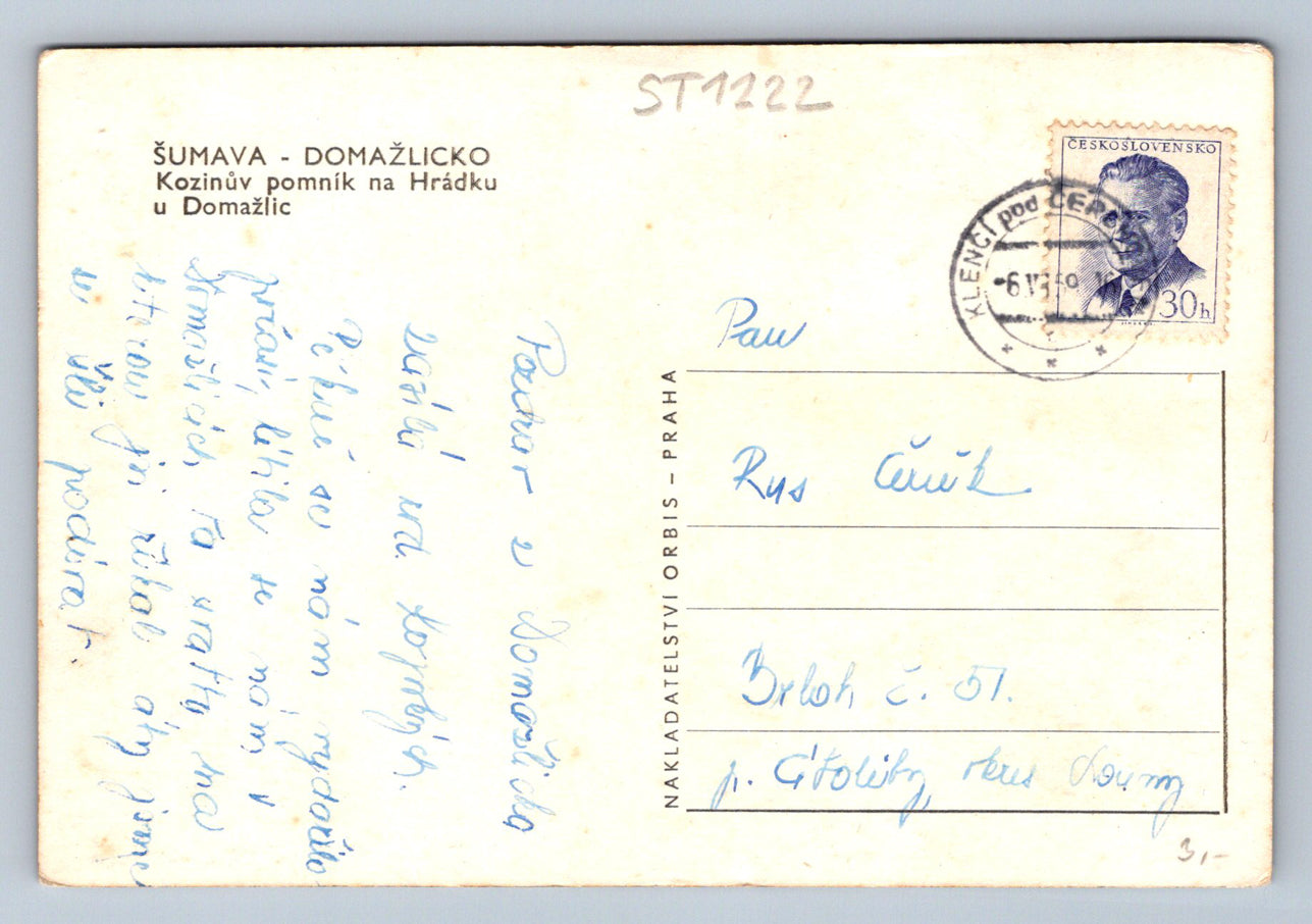 Pohlednice ŠUMAVA - DOMAŽLICKO - KOZINŮV POMNÍK NA HRÁDKU U DOMAŽLIC (ST1222)