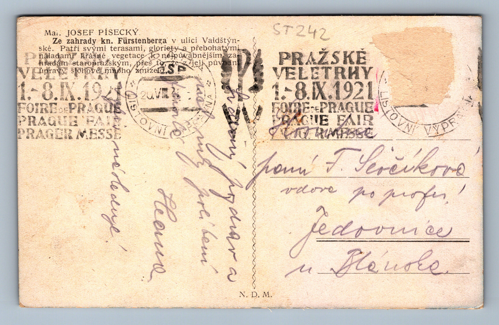 Pohlednice MAI JOSEF PÍSECK ZE ZAHRADY KN FRUSTEBERGA PRAŽSKÉ VELETRHY 1921 (ST242)