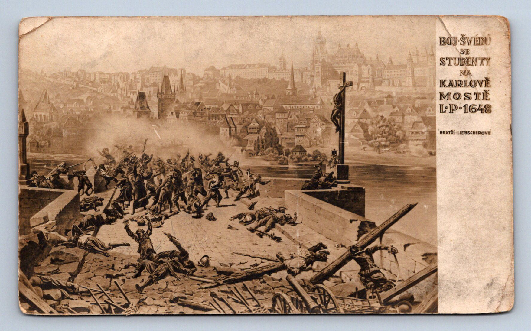 Pohlednice BOJ ŠVÉDŮ SE STUDENTY NA KARLOVĚ MOSTĚ 1648 (ST2444)