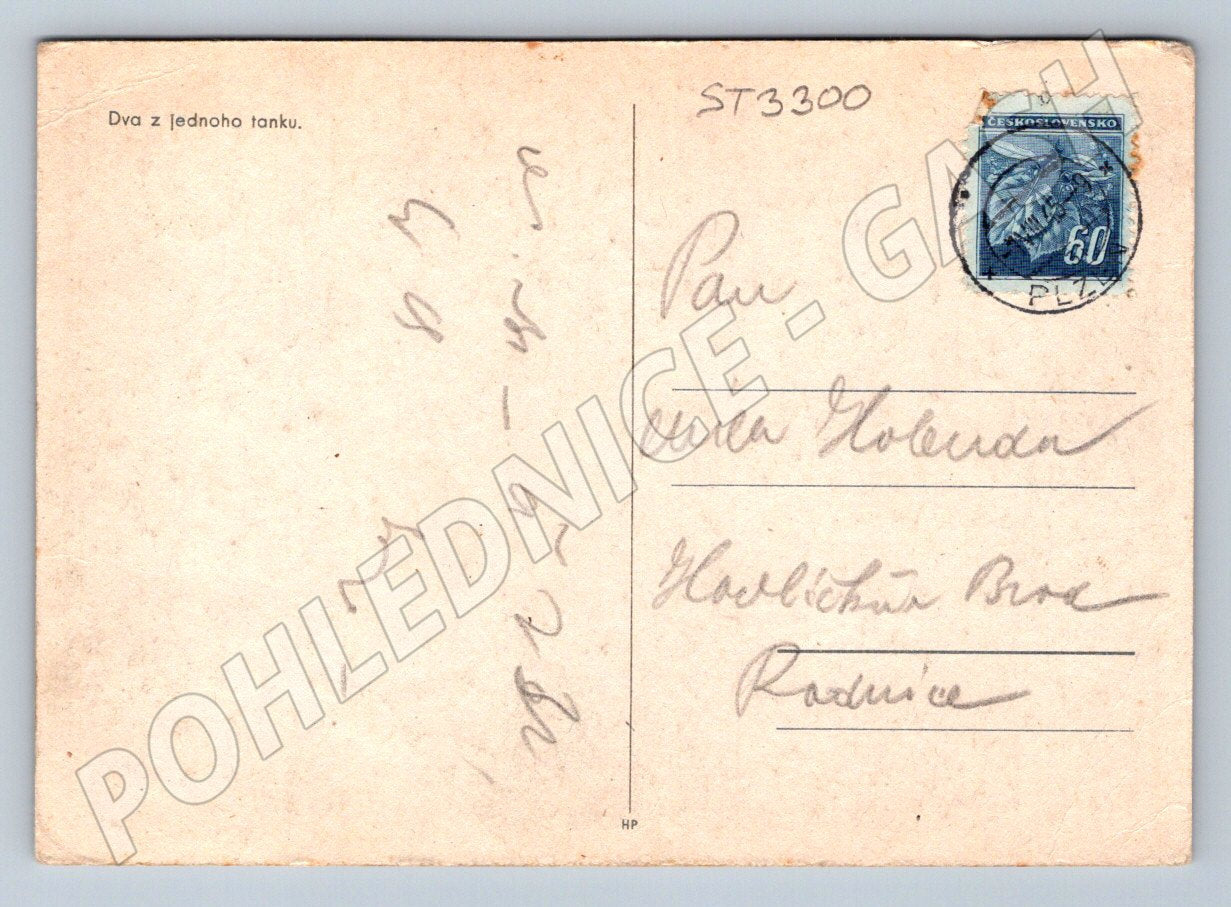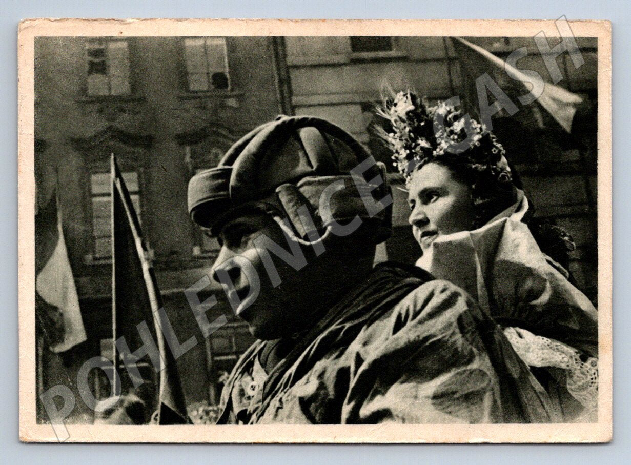 Originální černobílá pohlednice z období SSSR, s názvem Den z jednoho tanku . Na přední straně je fotografie vojáka v tankové helmě a slavnostně oblečené dívky s květinovým věncem, kteří se účastní veřejné oslavy či vojenské přehlídky, pravděpodobně v období po 2. světové válce. Zadní strana obsahuje známku SSSR a ručně psané věnování adresované do Československa. Výrazná historická a sběratelská hodnota, vhodné pro sběratele militárií a starých pohlednic z východní Evropy.