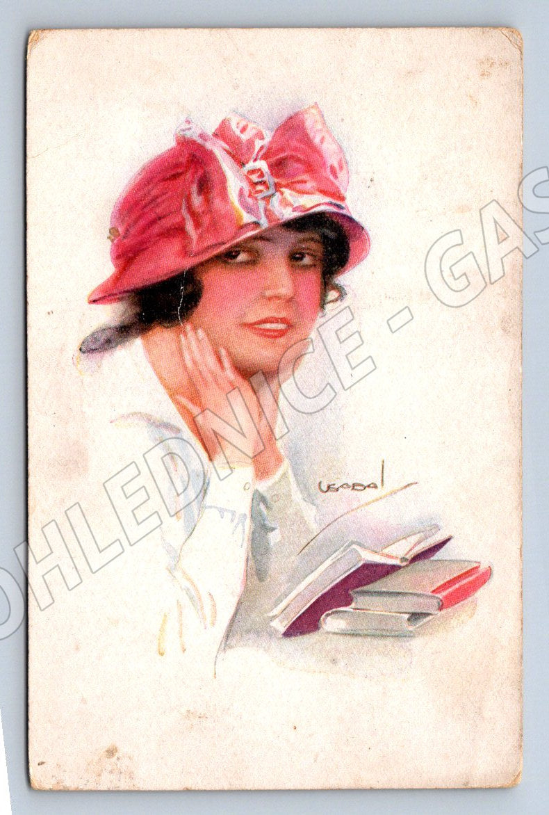 Nabízím zajímavou vintage pohlednici s kresbou ženy v červeném klobouku a bílém oděvu, stojící vedleknihy. Pohlednice je opatřena rukou psaným textem a adresou na zadní straně, což svědčí o jejím autentickém použití. Na přední straně je umělecký podpis autora Loseda . Pohlednice má znaky opotřebení typické pro svůj věk, drobné skvrny a ohyby, celkově je však ve sběratelsky zajímavém stavu. Skvělý doplněk do sbírek historických pohlednic zaměřených na motivy domácích spotřebičů a módy první poloviny 20. století.