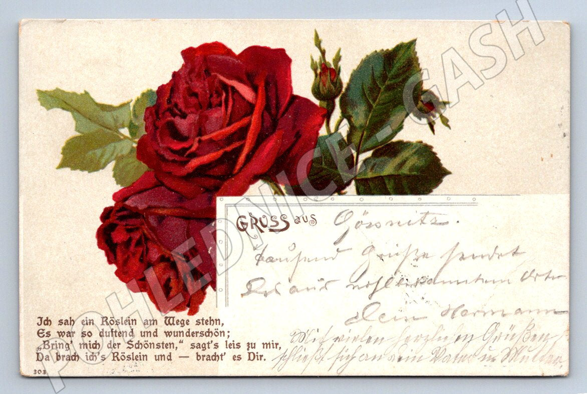 Nabízím starou pohlednici s motivem červené růže a krátkým německým veršem. Pohlednice byla zaslána z Německa a má originální poštovní známku s razítkem. Na zadní straně je rukou psaný vzkaz a adresa adresátky v Lipsku. Celkově je stav pohlednice velmi pěkný, barvy na přední straně jsou stále syté. Jedná se o sběratelsky zajímavý kus vhodný do sbírky pohlednic s květinovými motivy nebo zahraniční korespondencí z počátku 20. století.