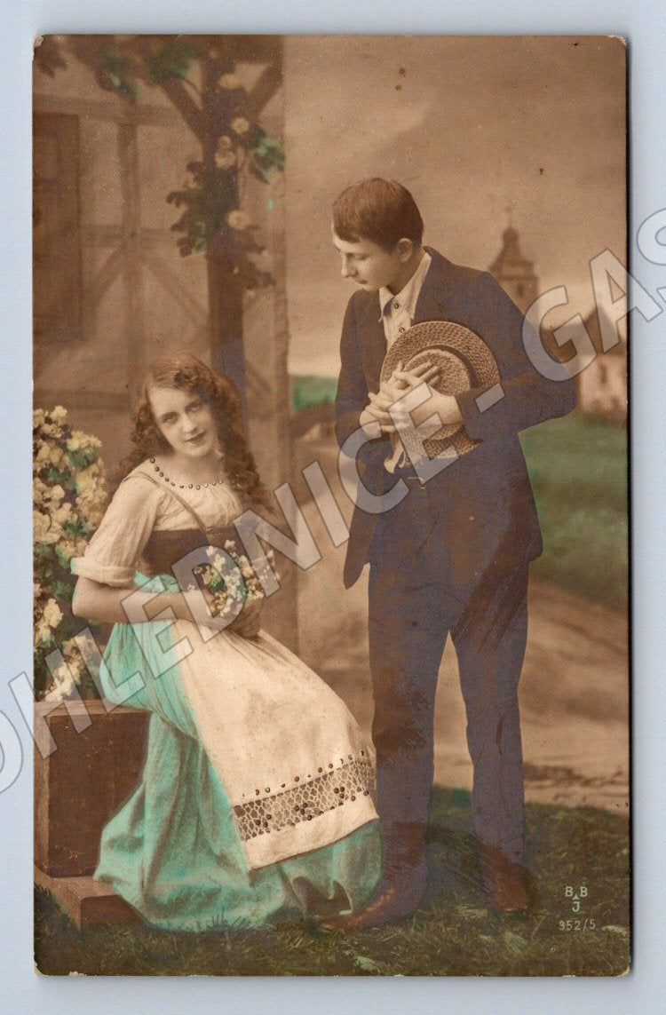 Starší pohlednice zobrazující žánrovou scénu mladého páru – dívky v pestře barevných šatech s květinou a mladíka v obleku se slaměným kloboukem. Kolorovaná fotografie s jemnými tóny, stylizovaná do atmosféry přelomu 19. a 20. století. Pohlednice nese známky stáří (patina, drobné skvrny a opotřebení rohů). Z rubové strany čistá, bez popisu a známky, pouze číselné označení. Atraktivní sběratelský kousek vhodný do kolekce žánrových či osobnostních pohlednic.