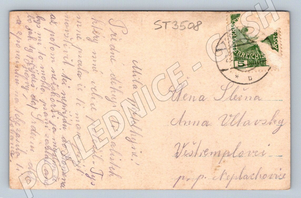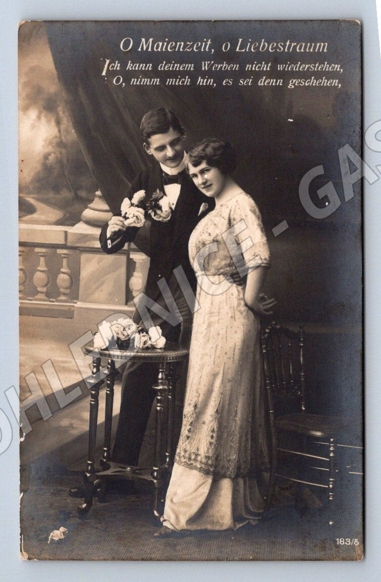 Starobylá černobílá pohlednice s romantickým námětem páru v interiéru. Na lícové straně je zobrazen elegantní muž a žena ve svátečním oblečení, v pozadí stylizované květiny a dekorace. Pohlednice je doplněna německým textem O Maienzeit, o Liebestraum . Rubová strana je opatřená rukopisným českým textem, rakouskou známkou a poštovním razítkem. Stáří pohlednice lze odhadnout dle známky a stylu na začátek 20. století. Ideální do sbírky historických a sentimentálních pohlednic.