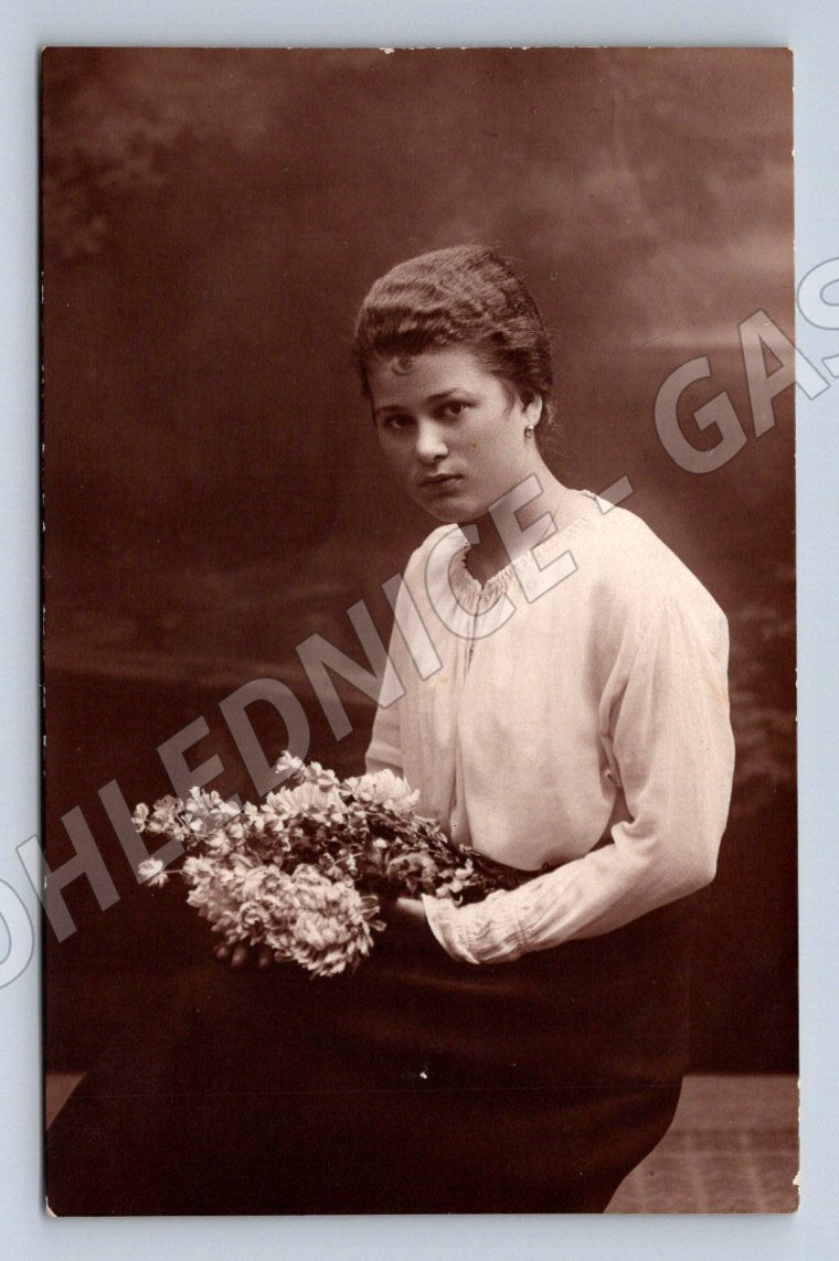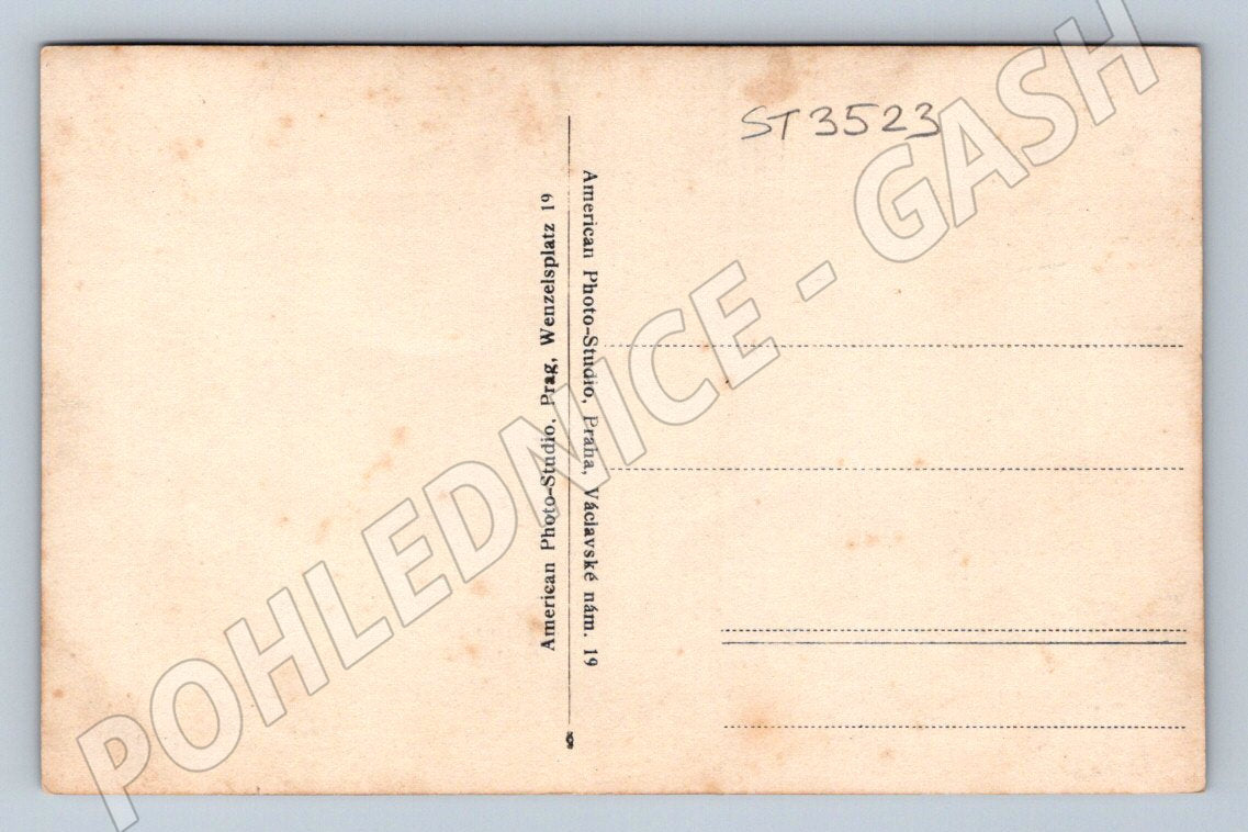 Originální stará pohlednice s portrétem mladé ženy držící kytici květin, snímek pochází ze slavného American Photo-Studio, Praha, Václavské náměstí 19. Jedná se o černobílou fotografii, pravděpodobně z první poloviny 20. století. Na pohlednici je krásně zachycen jemný výraz a styl tehdejší módy – jednoduchá halenka a přírodní účes. Zadní strana je neprošlá, lehce nažloutlá, s drobnými známkami stáří (viz foto), označena číslem ST3523. Skvělý sběratelský kus pro milovníky historických portrétních pohlednic nebo zájemce o pražskou fotohistorii.