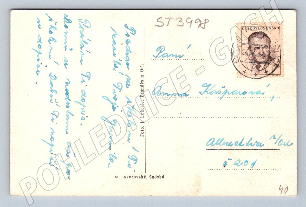 Originální dobová pohlednice města Brandýs nad Orlicí. Na pohlednici je detailní černobílý pohled na městskou krajinu s výraznou železniční tratí a nádražím v popředí. V dálce je vidět městská zástavba, továrna a okolní kopcovitá krajina. Zadní strana je popsána a je na ní nalepená poštovní známka z období Československa s čitelným razítkem. Pohlednice je vhodná pro sběratele železniční historie, milovníky pohlednic z regionu nebo zájemce o staré poštovní artefakty. Stav odpovídá stáří, rohy lehce opotřebované, viz foto.