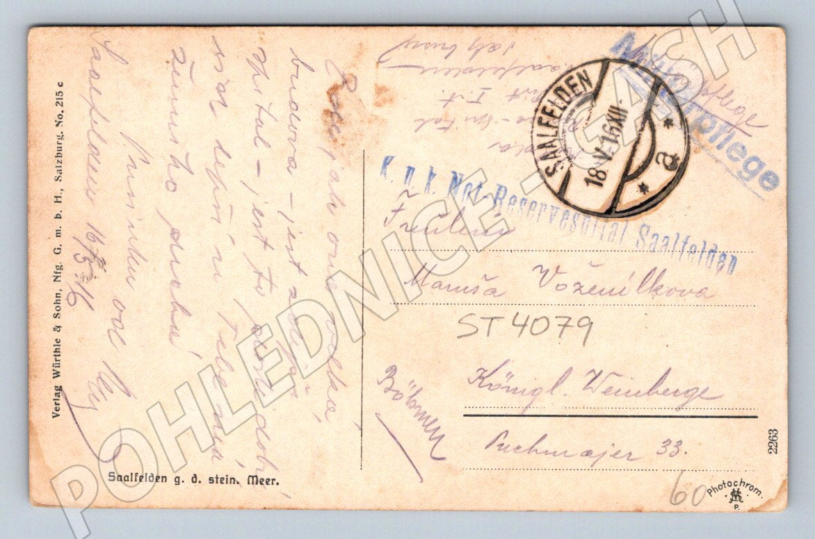 Originální stará pohlednice zobrazující město Saalfelden v Rakousku s panoramatem pohoří Steinernes Meer v pozadí. Pohlednice je ve velmi pěkném dochovalém stavu, na přední straně je barevný tisk s detailním pohledem na město, dominantou je zdejší kostel a okolní alpské hory. Zadní strana obsahuje ručně psaný vzkaz a známku poštovního razítka Saalfelden datovanou 18.V.15. Výrazný dobový charakter, tisk Verlag Würthle & Sohn, Salzburg, č. 22163. Ideální pro sběratele pohlednic z Rakouska nebo milovníky alpské krajiny.