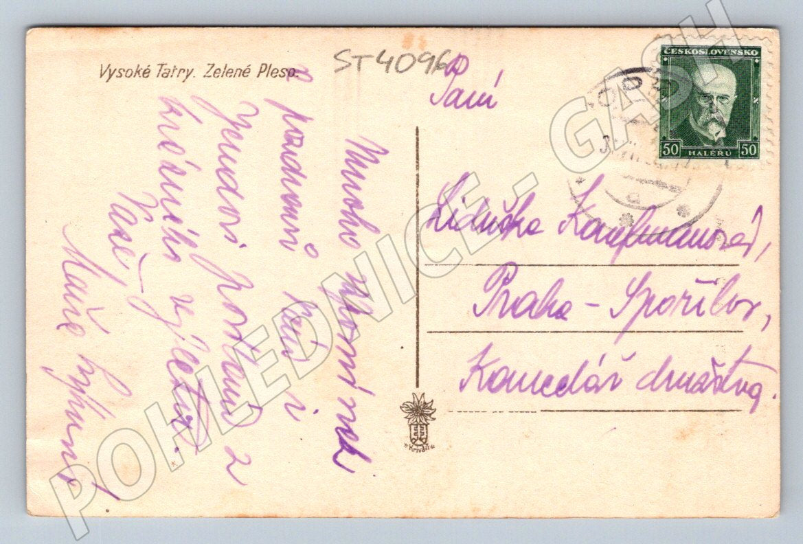 Originální historická pohlednice znázorňující Vysoké Tatry, konkrétně Zelené pleso. Pohlednice je malého formátu a pochází z období před rokem 1950. Na přední straně je černobílá fotografie s výraznou horskou krajinou a chatou u Zeleného plesa. Zadní strana je popsána ručně fialovým inkoustem, opatřená dobovou známkou a razítkem, což potvrzuje její autentičnost a použití v minulosti. Vhodné pro sběratele starých pohlednic, milovníky hor, Tater či slovenské historie. Celkový stav dle fotografií, stáří znatelné na okrajích, nepatrné opotřebení.