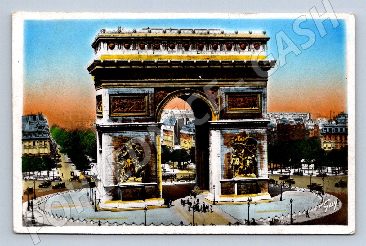 Originální stará pohlednice s motivem ikonického pařížského památníku – Vítězný oblouk (Arc de Triomphe de l Étoile). Pohlednice je kolorovaná, zachycuje detailní pohled na monument i okolní pařížské bulváry v pozadí. Na zadní straně je ručně psaný vzkaz, známka a razítko z roku 1937, které dokládají její historickou hodnotu. Celkový stav pohlednice odpovídá stáří, mírné opotřebení hran, zachovalé barvy a dobře čitelné poštovní údaje. Skvělý sběratelský kousek pro milovníky Francie, Paříže nebo historických pohlednic z Evropy.