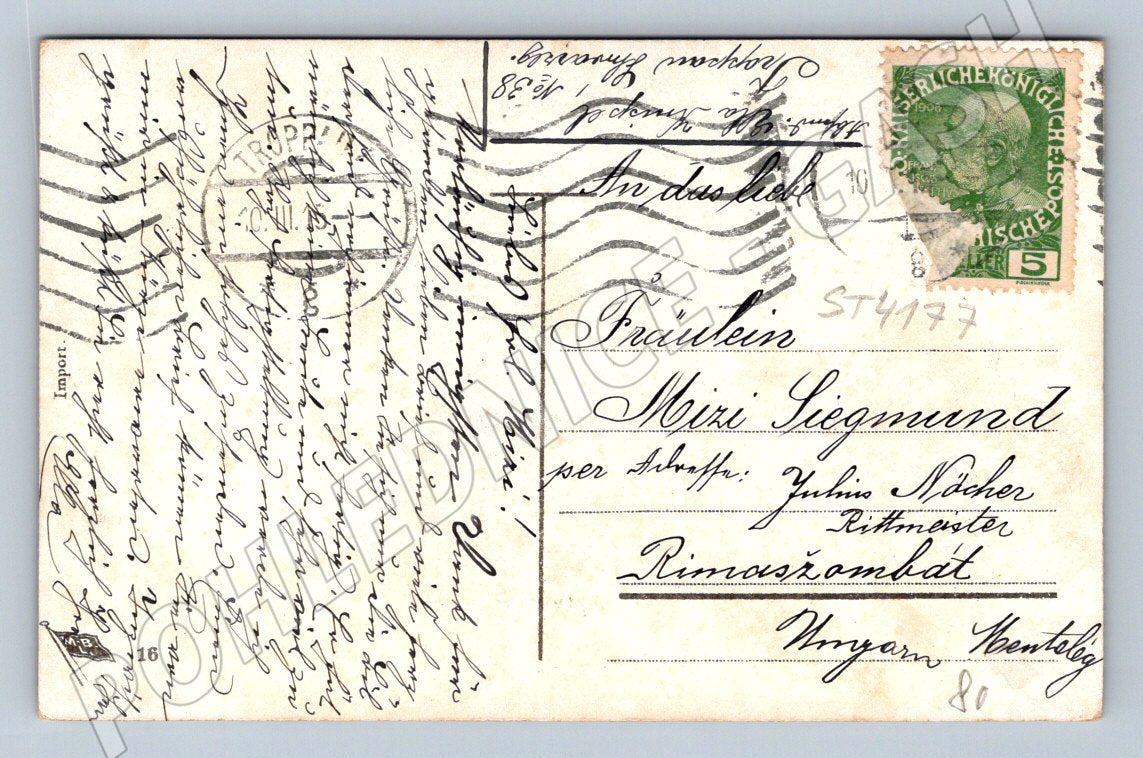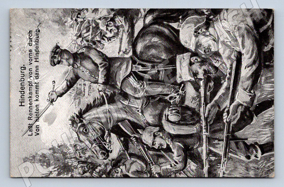 Historická pohlednice s názvem Hindenburg - Lask. Rennenkampff von vorne durch Von, Hinten kommt dann Hindenburg z období první světové války. Na pohlednici je zobrazen boj pruských vojáků na koních a pěchoty, tematika se vztahuje k vojenskému konfliktu a postavě generála Hindenburga. Pohlednice je černobílá, má ručně psaný text a byla odeslána s dobovou známkou německé říše (stempel TROPPAU 1915). Pohlednice je adresována slečně Mizzi Siegmund do Rimoszombat, tehdejší Uhersko. Celkově velmi zajímavá militaria a sběratelský kousek vhodný do sbírky historických pohlednic z Německa a první světové války. Stav odpovídá stáří, viz foto.