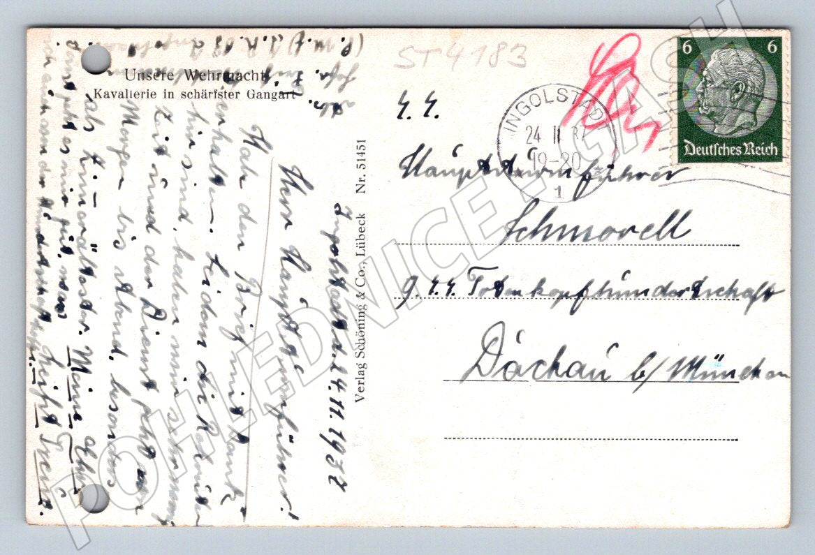 Originální historická pohlednice s motivem německé kavalerie na koních. Na přední straně je černobílá fotografie skupiny jezdců v uniformách projíždějících zalesněným terénem. Zadní strana je popsána německým textem, opatřena známkou Německé říše (Deutsches Reich) a poštovním razítkem z roku 1937. Pohlednice je vhodná pro sběratele historických, válečných i koňských motivů. Stav odpovídá stáří, na obou stranách jsou otvory z archivace. Jedná se o autentický sběratelský kus z období před druhou světovou válkou.