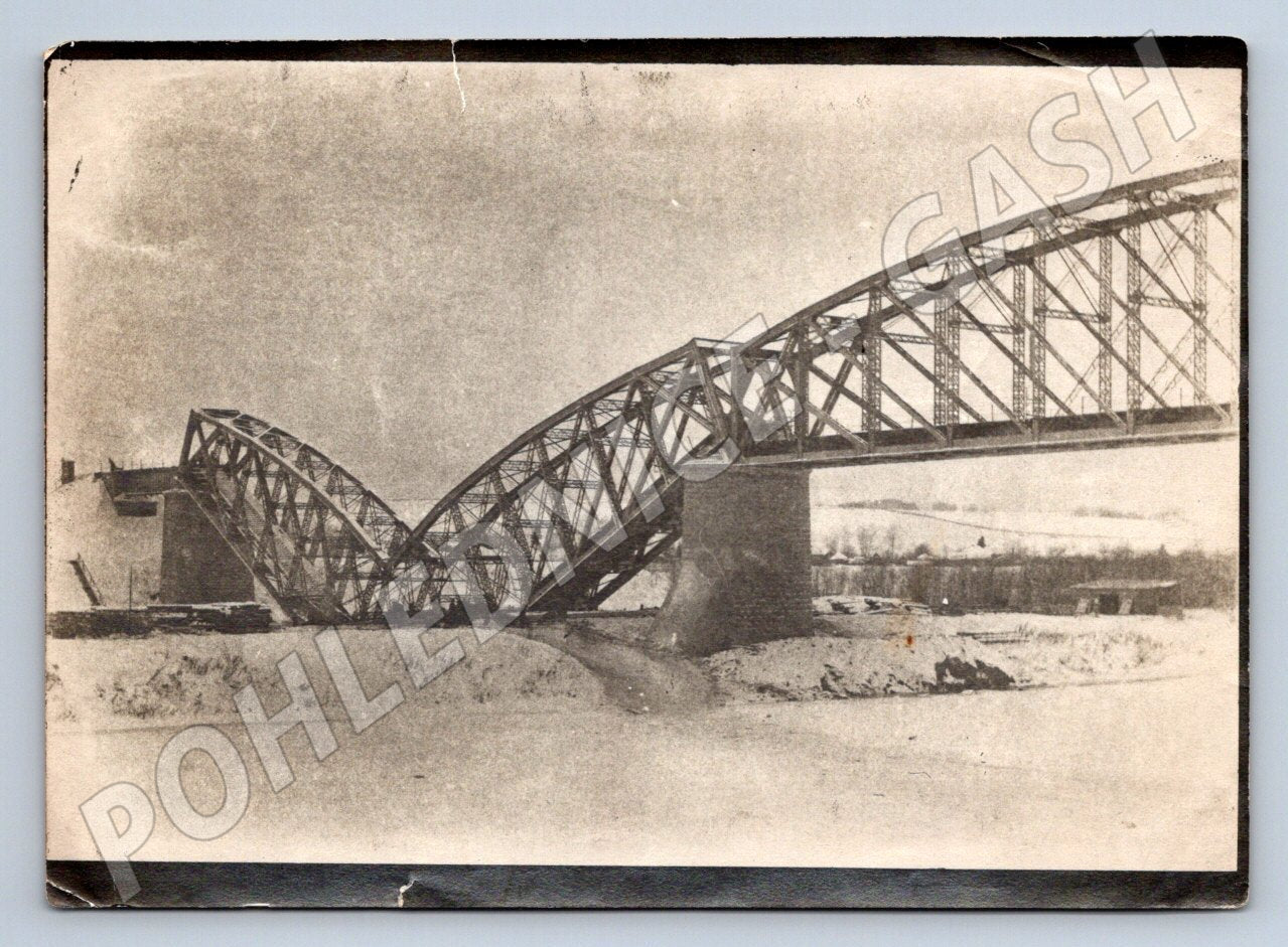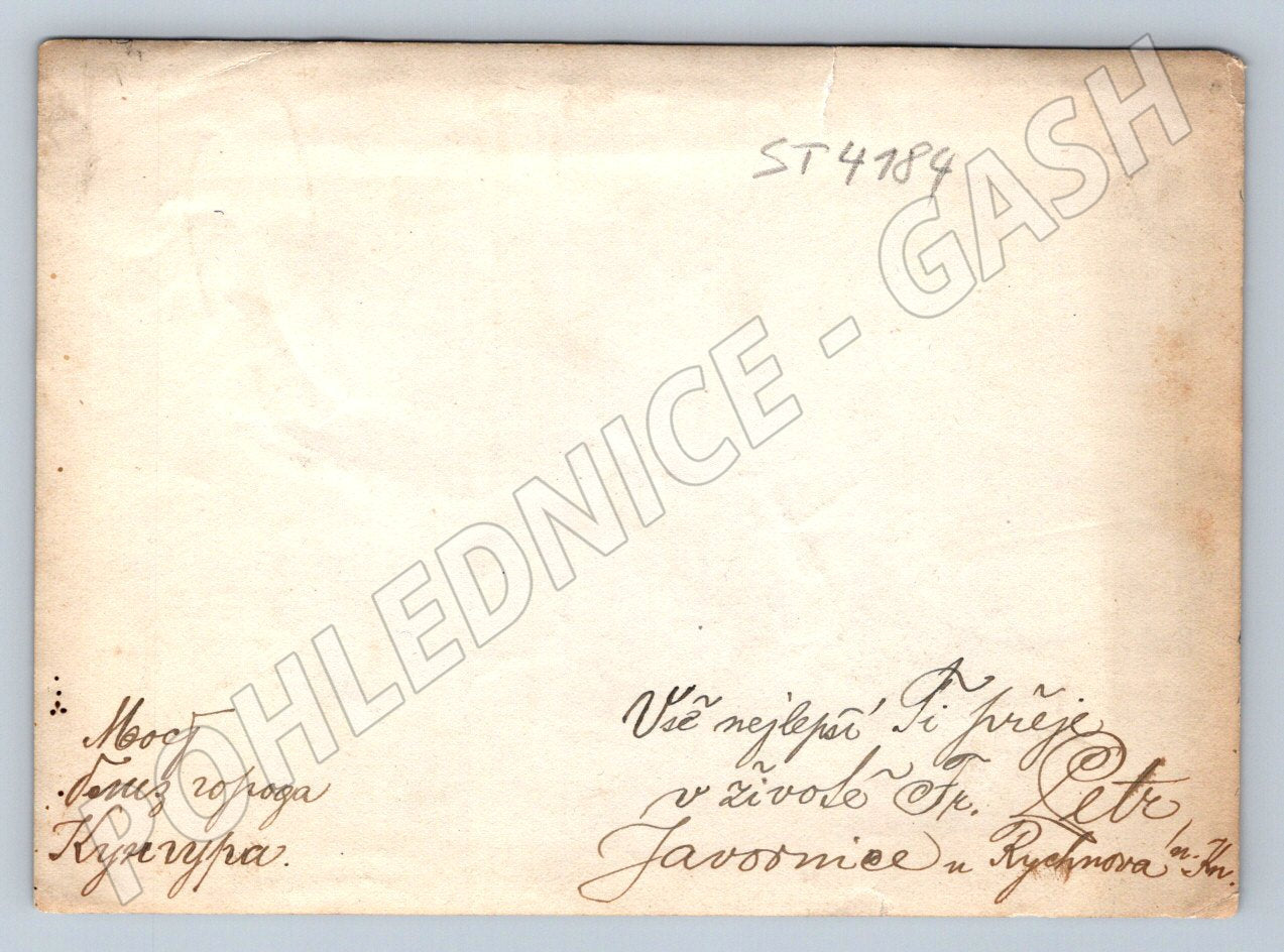 Starobylá pohlednice zobrazující železniční most nedaleko města Kurgan (pravděpodobně Rusko/Sibiř). Na přední straně je černobílá fotografie masivní mostní konstrukce přes zamrzlou řeku v zimní krajině. Lze si povšimnout dobové struktury a typických trojúhelníkových nosníků. Zadní strana obsahuje ručně psaný text v češtině a ruštině, což zvyšuje sběratelskou hodnotu pohlednice. Pohlednice nese stopy stáří, drobné otěry na okrajích a zažloutnutí papíru. Vhodné pro sběratele tematicky zaměřené na železniční dopravu nebo historické pohlednice z Ruské/Sovětské oblasti. Мост близ города Куренура JAVORNICE U RYCHNOVVA AD KNĚŽNOU