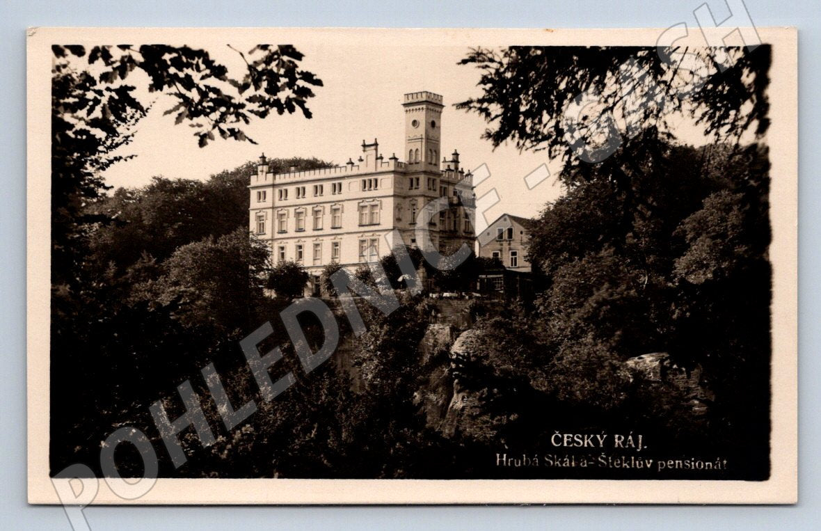 Originální pohlednice s motivem z Českého ráje – Hrubá Skála a Šteklův pensionát. Na přední straně je krásná černobílá fotografie zámku Hrubá Skála, zasazeného do malebné přírody obklopující skály a lesy. Pohlednice je neprošlá, na zadní straně je razítko hotelu Hrubá Skála v Českém ráji u Turnova. Výborný sběratelský stav, bez známky a zápisu. Velmi hezký historický dokument z oblasti Českého ráje a oblíbená lokalita turistů i milovníků českých památek.