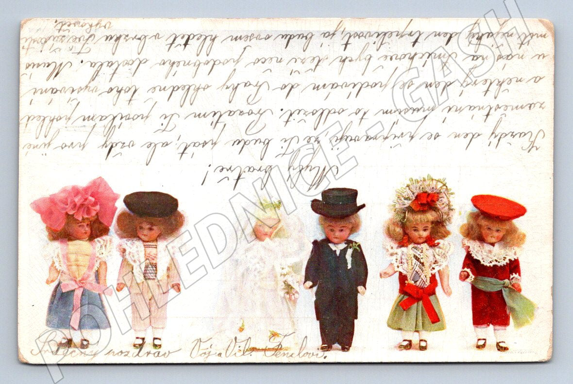 Originální stará pohlednice s motivem panenek v historickém oblečení. Na přední straně je vyobrazena skupina šesti panenek ve slavnostních šatech a kloboucích, každá panenka má jedinečný dobový kostým. Povrch pohlednice je ručně popsaný, což dodává sběratelskou hodnotu. Zadní strana obsahuje poštovní razítka a adresu, známka je chybějící. Pohlednice byla zaslána z města Smíchov panu Aloisi Bendovi do Českých Kubic. Výrobce Unie Prague. Jedná se o pěkný sběratelský kousek z počátku 20. století. Stav dle fotografií – mírně opotřebovaná, drobné zašpinění a oděrky, pravý horní roh zadní strany má známky poškození.