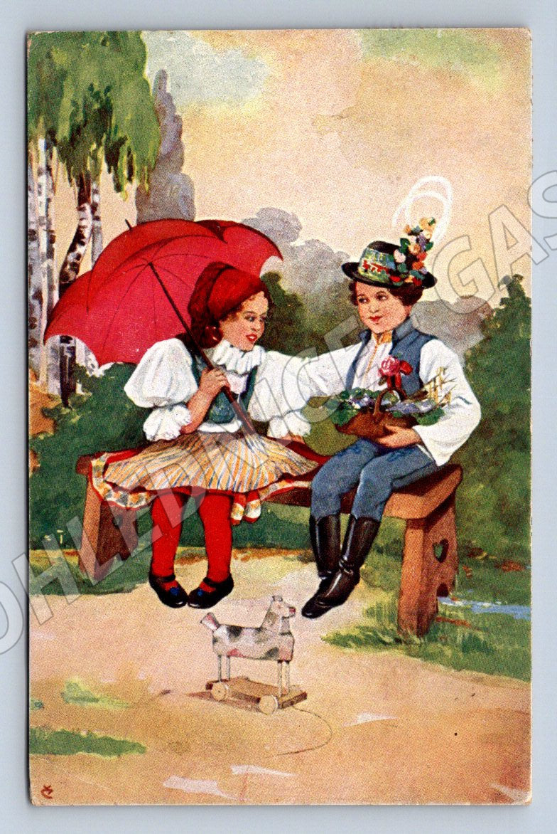 Originální stará pohlednice s etnografickým motivem – lidový pár v tradičních krojích, ilustrovaná scénka z venkova. Pohlednice je prošlá poštou, opatřená rakousko-uherskou známkou a čitelným razítkem. Ručně psaný text adresovaný panu Emanuelu Sosnovcovi do Bláhova Shotě (Chlumec u Těčan). Na přední straně barevná ilustrace krojovaných postav s červeným deštníkem na lavičce ve venkovském prostředí. Vhodná do sbírky starých pohlednic s motivy folkloru a etnografie. Skvělý sběratelský kousek z období Rakouska-Uherska, vhodný pro milovníky starých pohlednic a lidových tradic.
