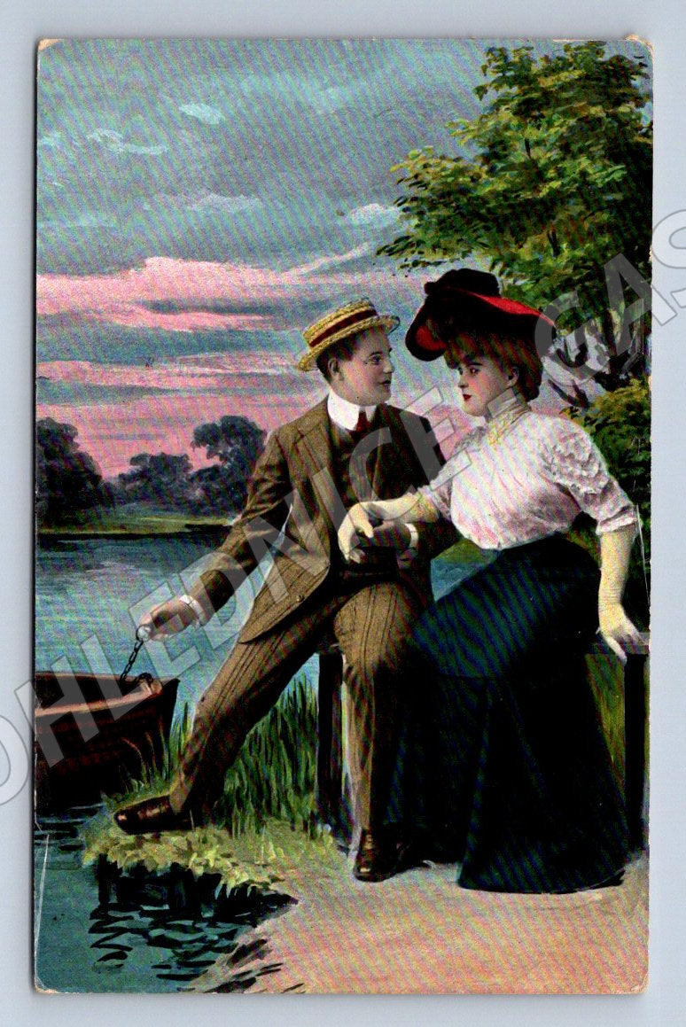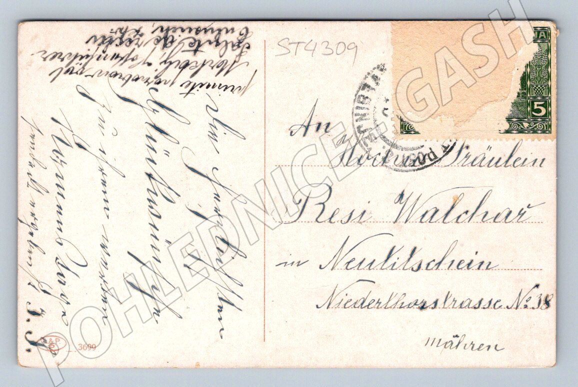 Starobylá pohlednice z období přelomu 19. a 20. století, adresovaná slečně v Novém Jičíně (Neutitschein, dnešní Česká republika). Na přední straně je romantická malovaná scéna – muž a žena v dobovém oblečení při procházce přírodou při západu slunce. Lícová strana je kolorovaná. Zadní strana obsahuje ručně psaný vzkaz, známku s částečně poničeným okrajem a čitelné poštovní razítko. Celkově pěkný stav odpovídající stáří – vhodné do sbírky historických pohlednic nebo jako originální dárek pro sběratele.