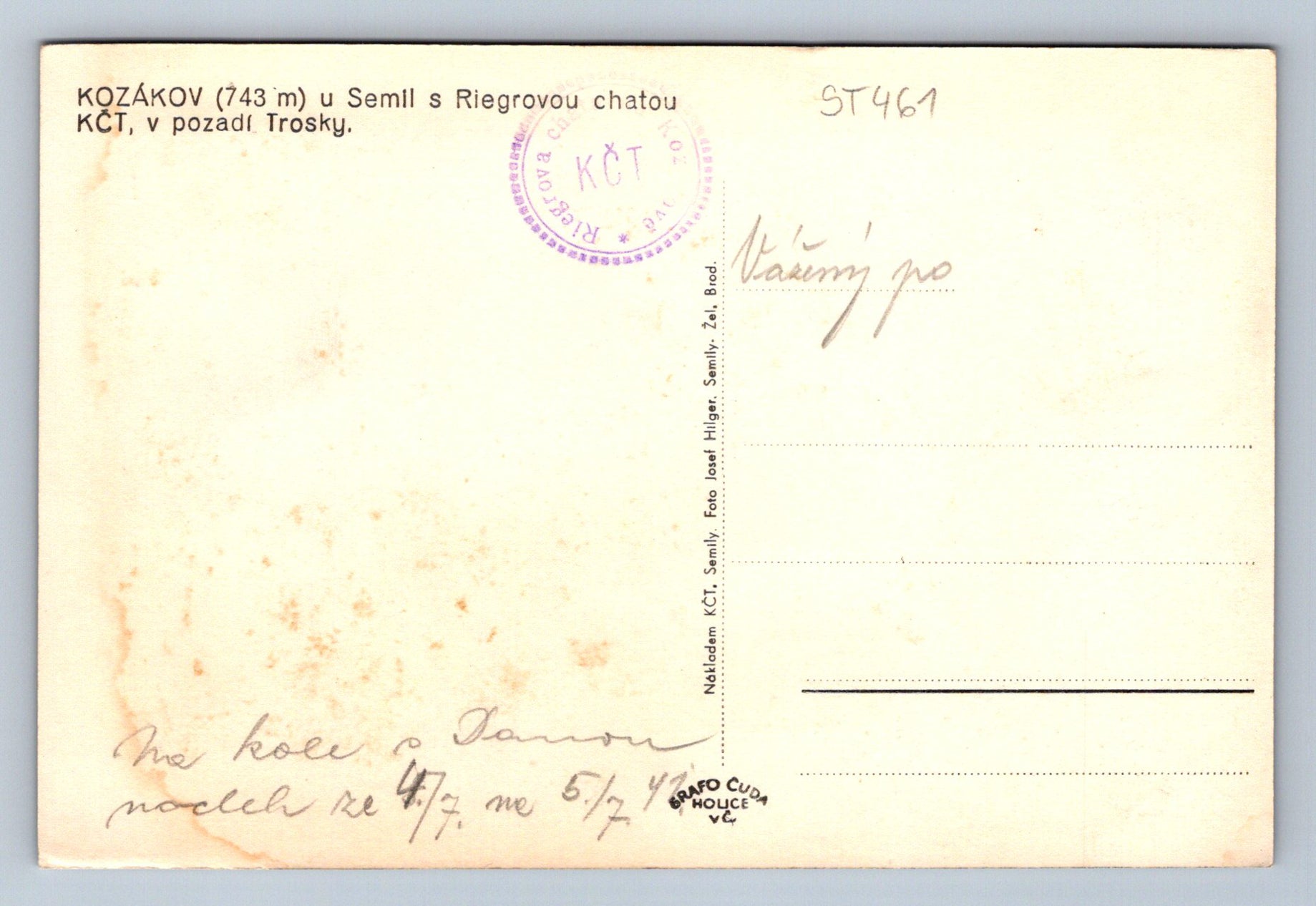 Pohlednice KOZÁKOV 743 M U SEMIL S RIEGROVOU CHATOU KČT TROSKY (ST461)