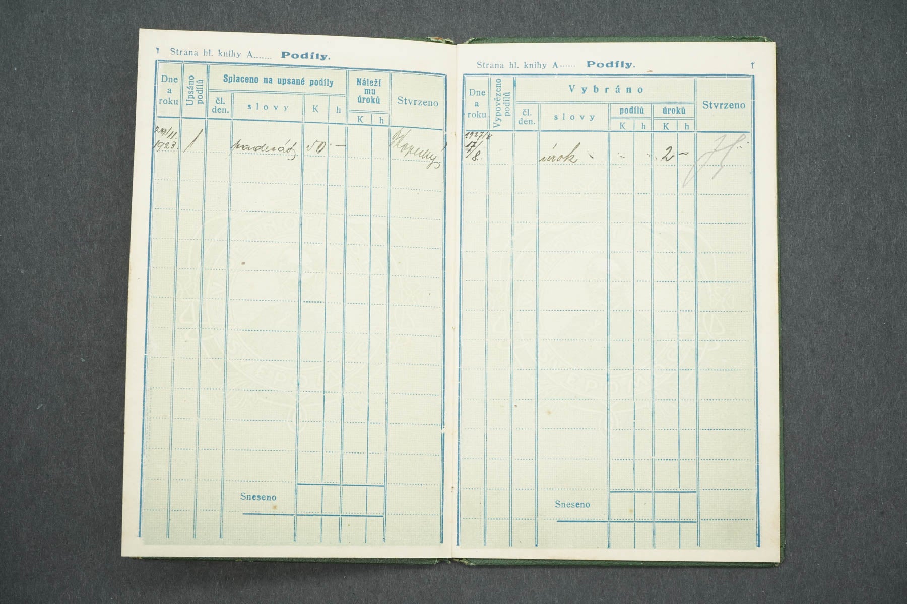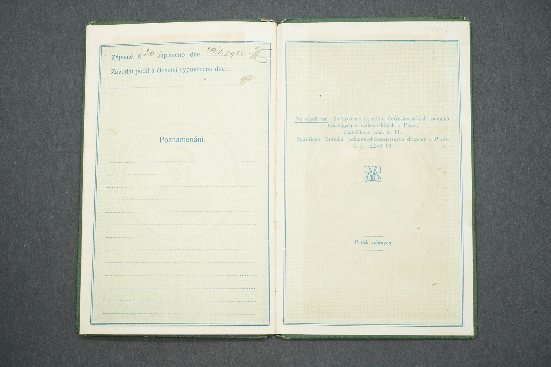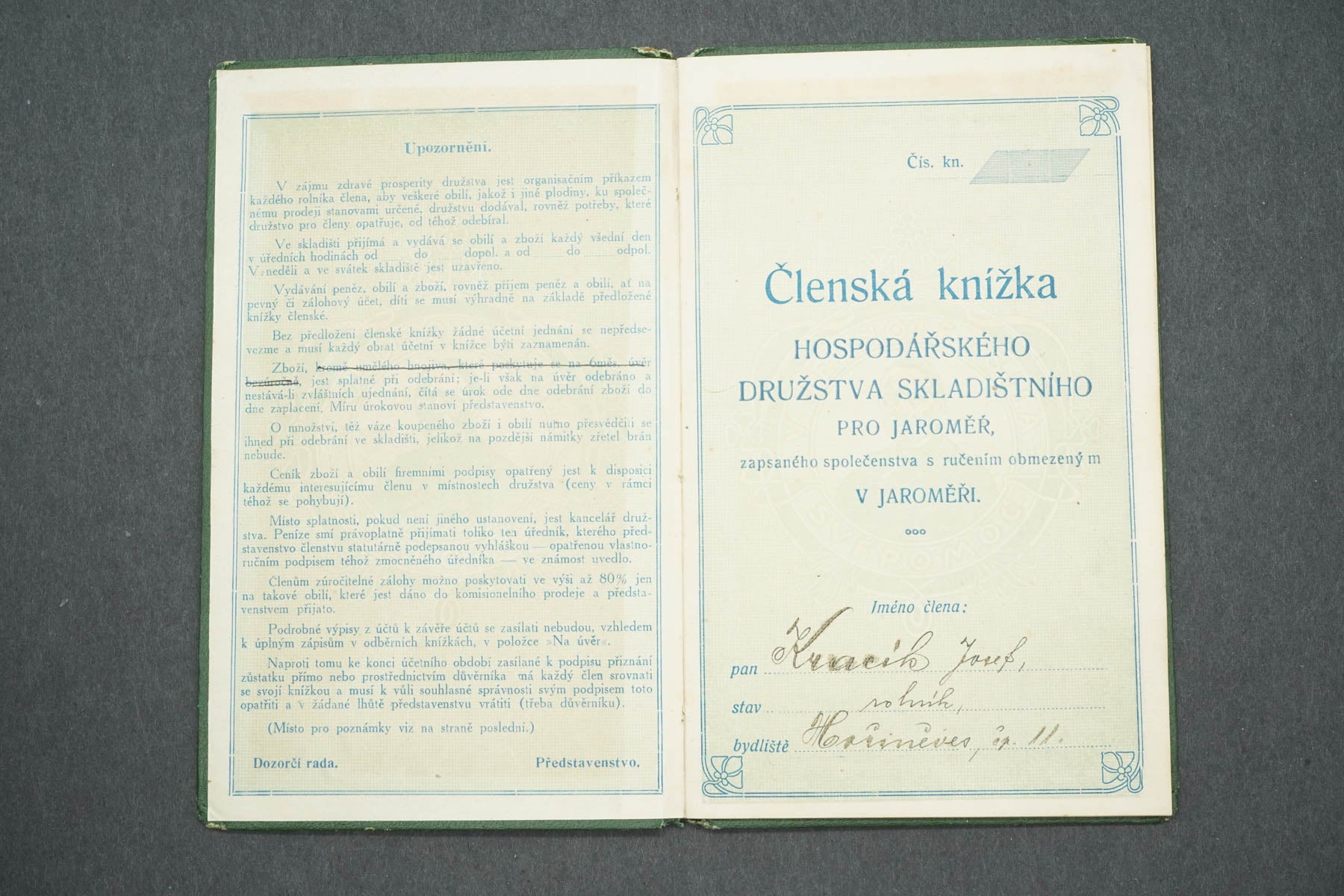 ČLENSKÁ KNÍŽKA HOSPODÁŘSKÉHO DRUŽSTVA SKLADIŠTNÍHO V JAROMĚŘI
