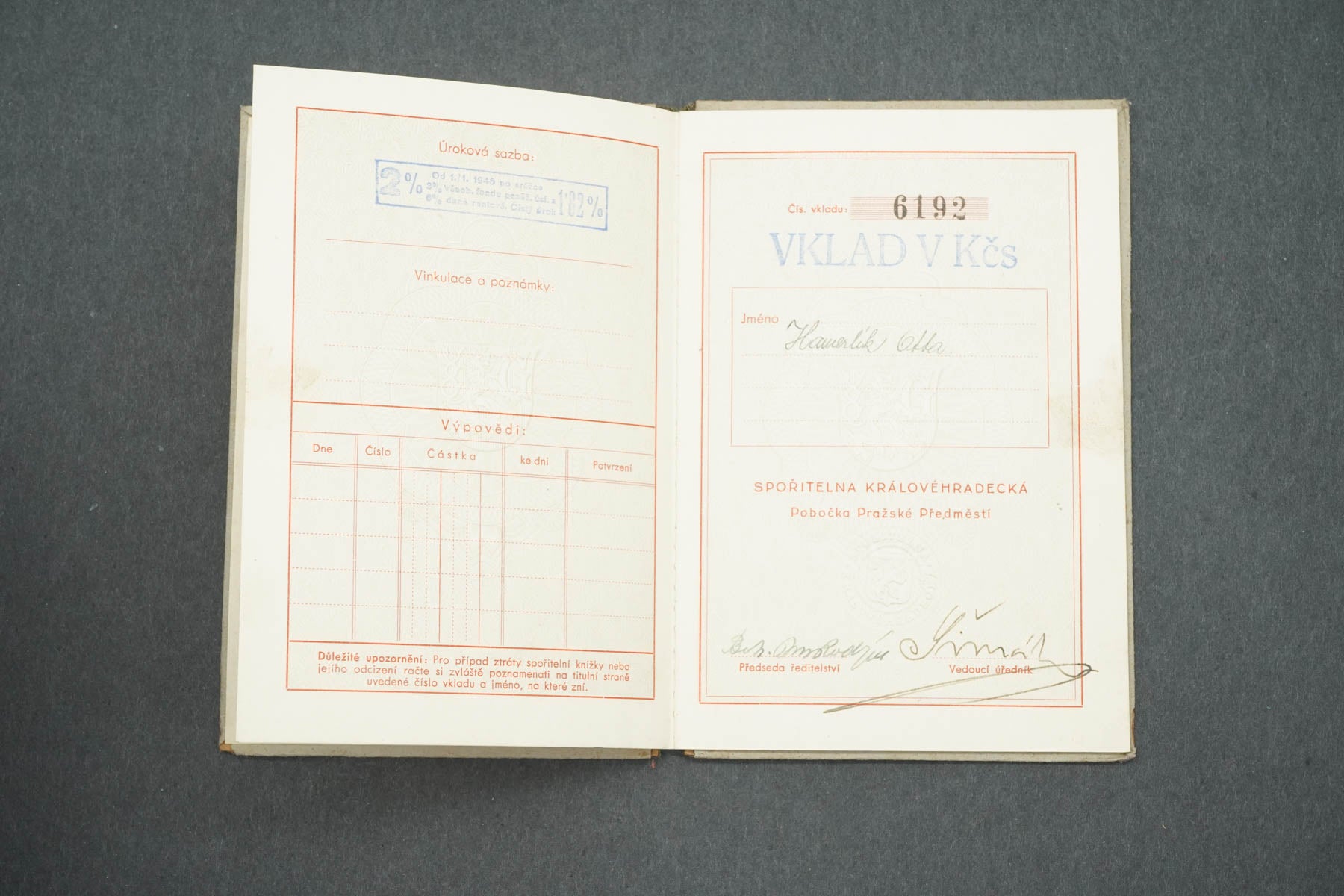 SPOŘITELNÍ KNÍŽKA SPOŘITELNA KRÁLOVÉHRADECKÁ HRADEC KRÁLOVÉ (x15016)