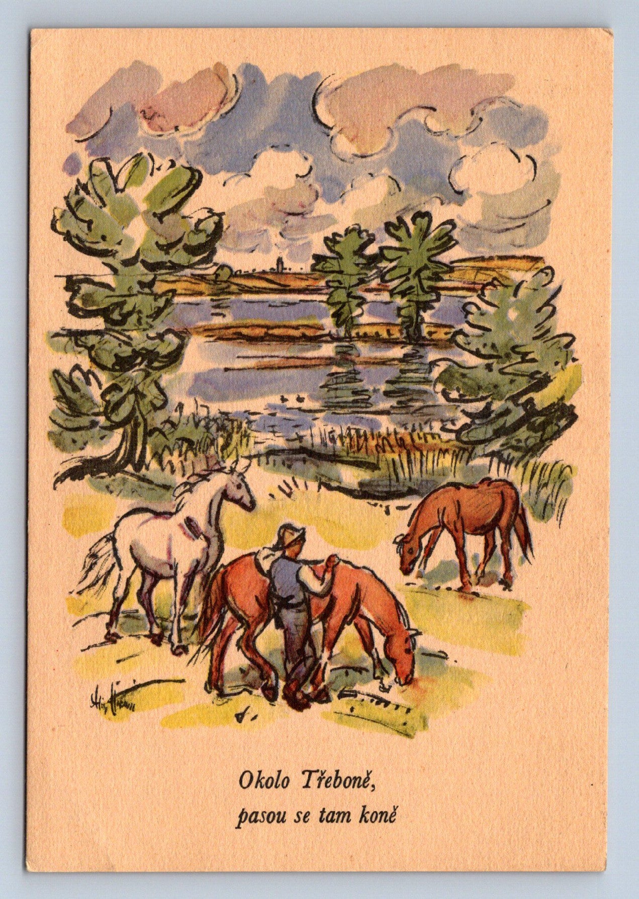 Pohlednice OKOLO TŘEBONĚ, PASOU SE TAM KONĚ (X23180)