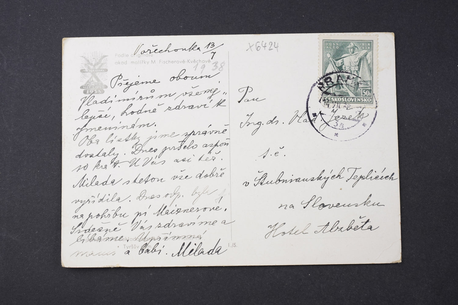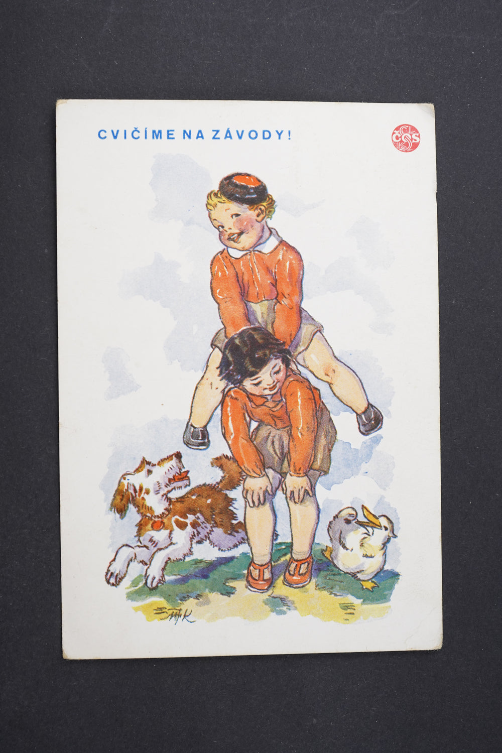 Pohlednice Cvičíme na závody Sokol podle malířky Ficherové kvěchové