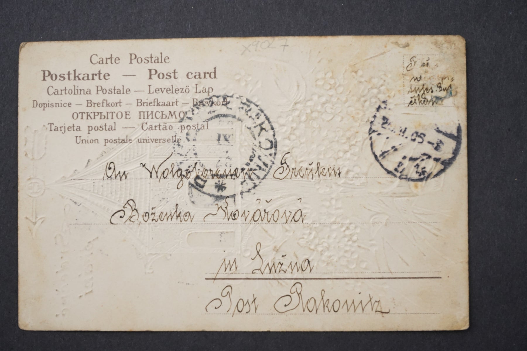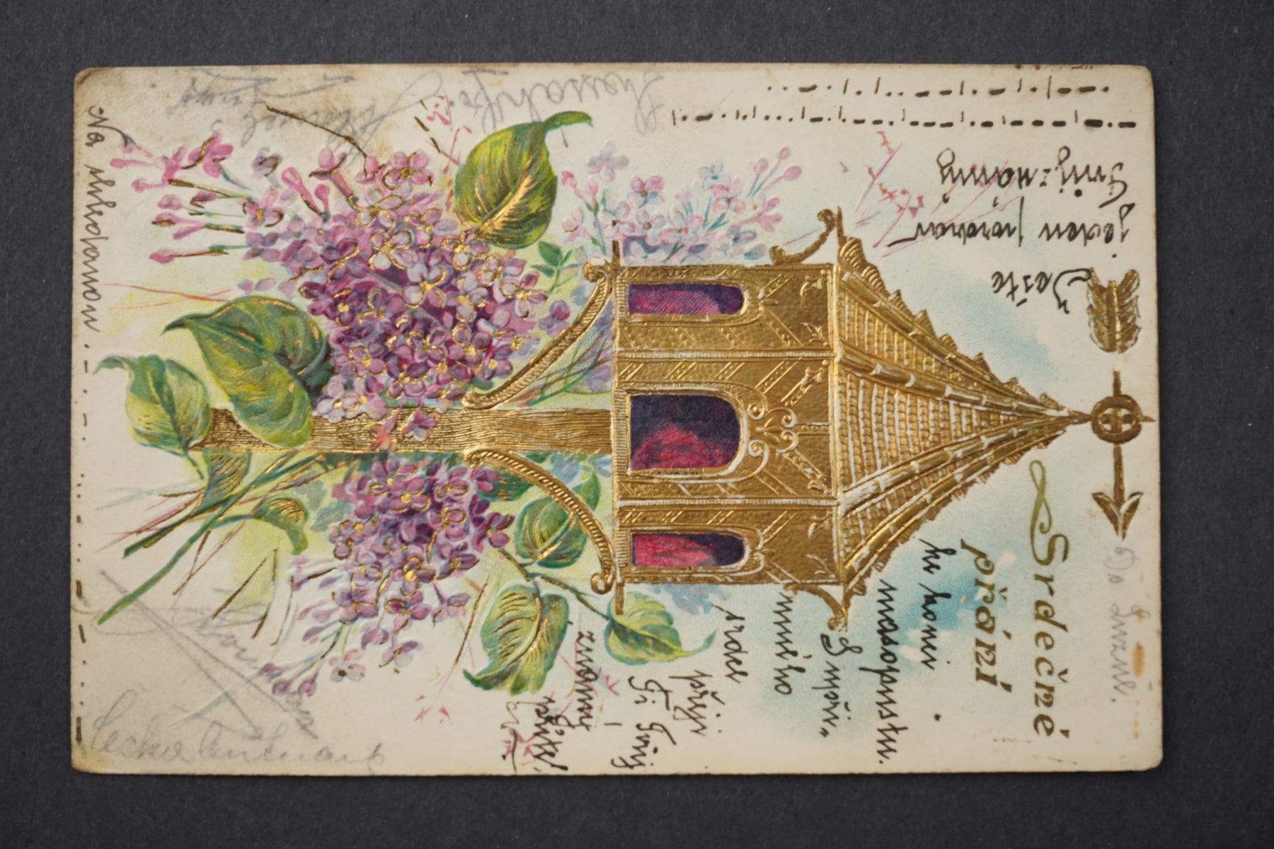 Pohlednice SRDEČNÉ PŘÁNÍ ZLACENÁ HOLUBÍ DŮM TLAČENÁ x9027