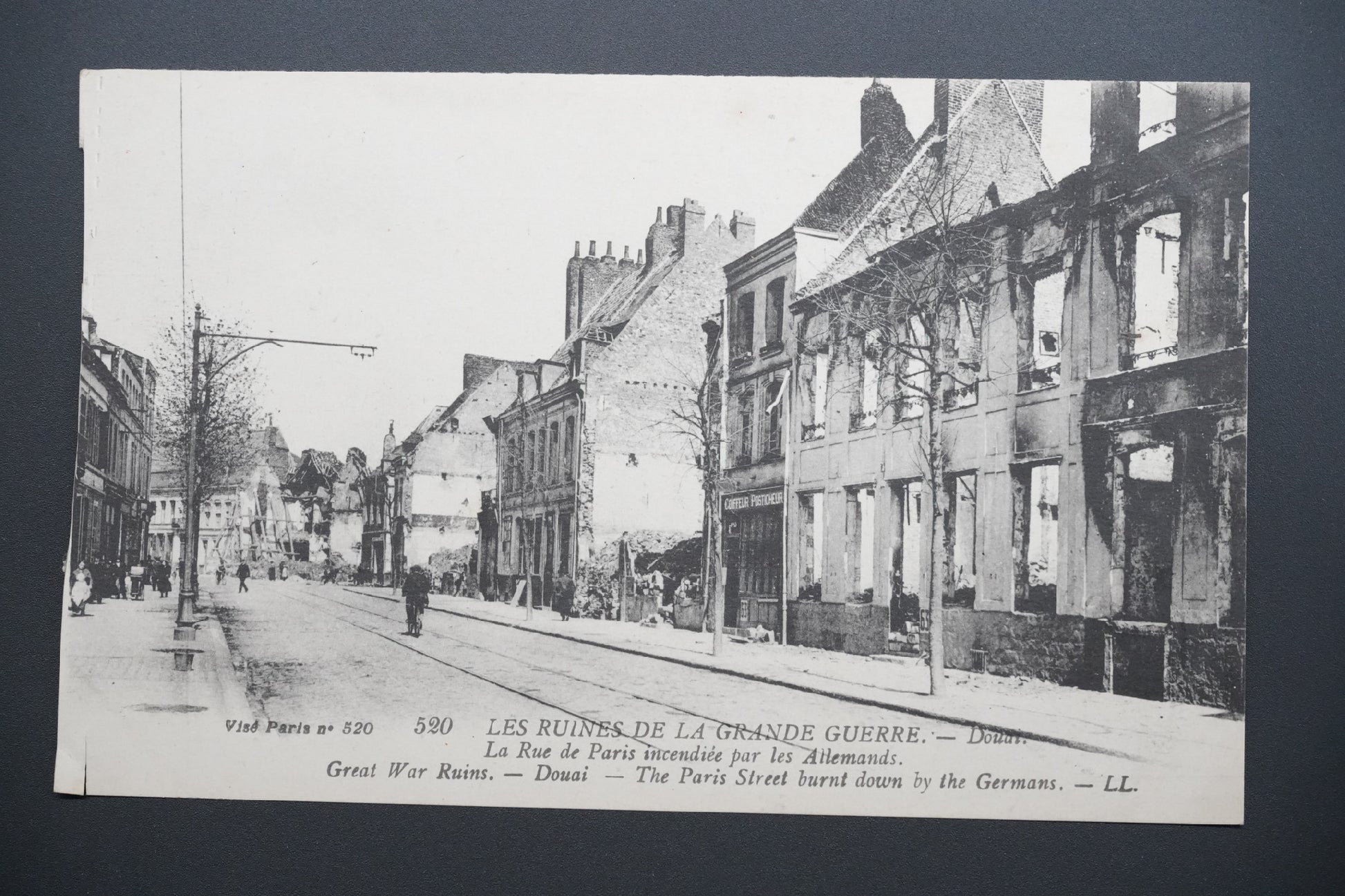 Pohlednice 520 LES RUINES DE LA GRANDE GUERRE. - Douai. - La Rue de Paris incendiee par les Allemands. GREAT WAR RUINS. - DOUAI. - THE PARIS STREET BURNT DOWN BY THE GERMANS. - LL