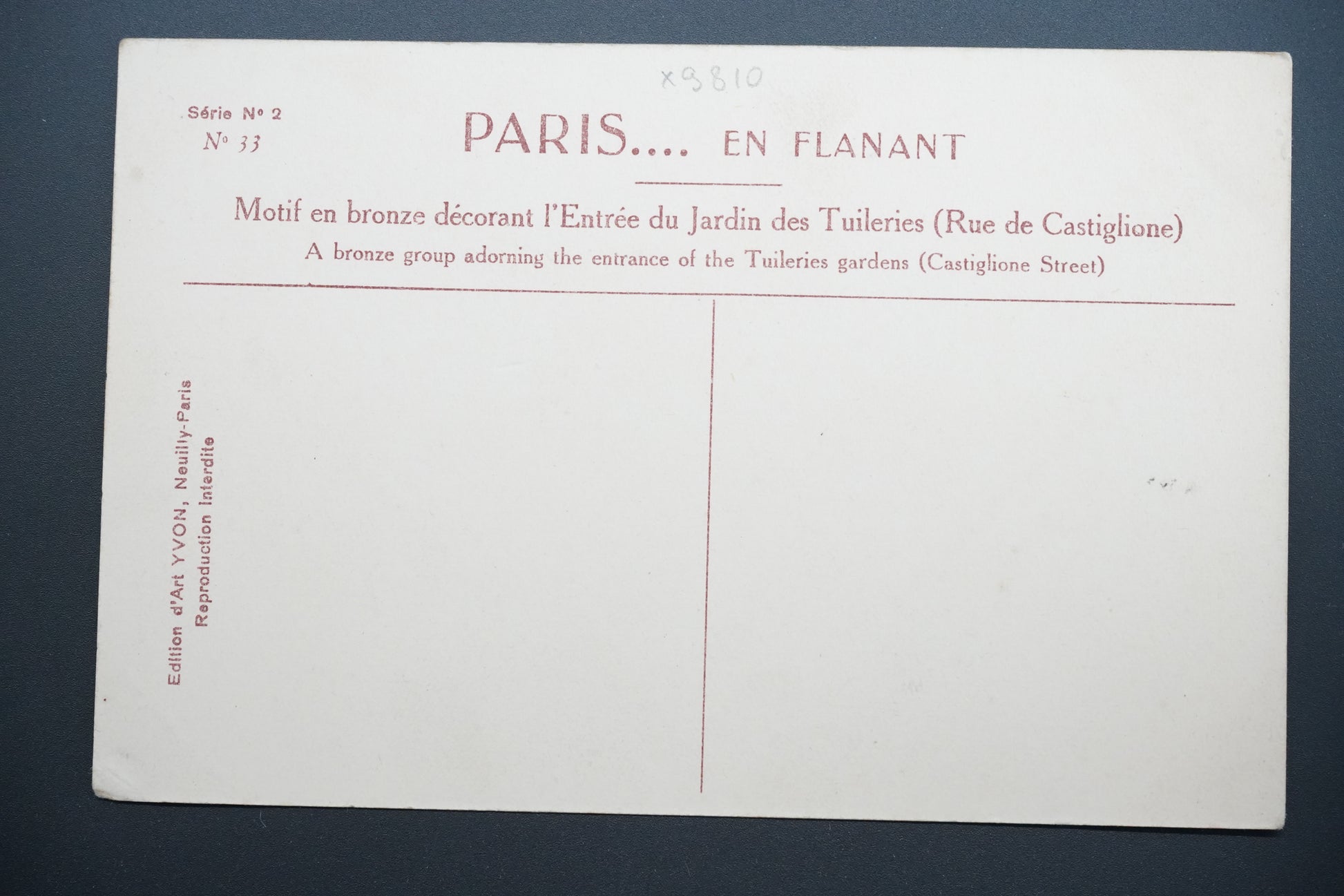 Pohlednice PARIS… EN FLANANT Motif en bronze decorant l`Entree du Jardin des Tuileries (Rue de Castiglione) - A BRONZE GROUP ADORNING THE ENTRANCE OF THE TUILERIES GARDENS (CASTIGLIONE STREET)
